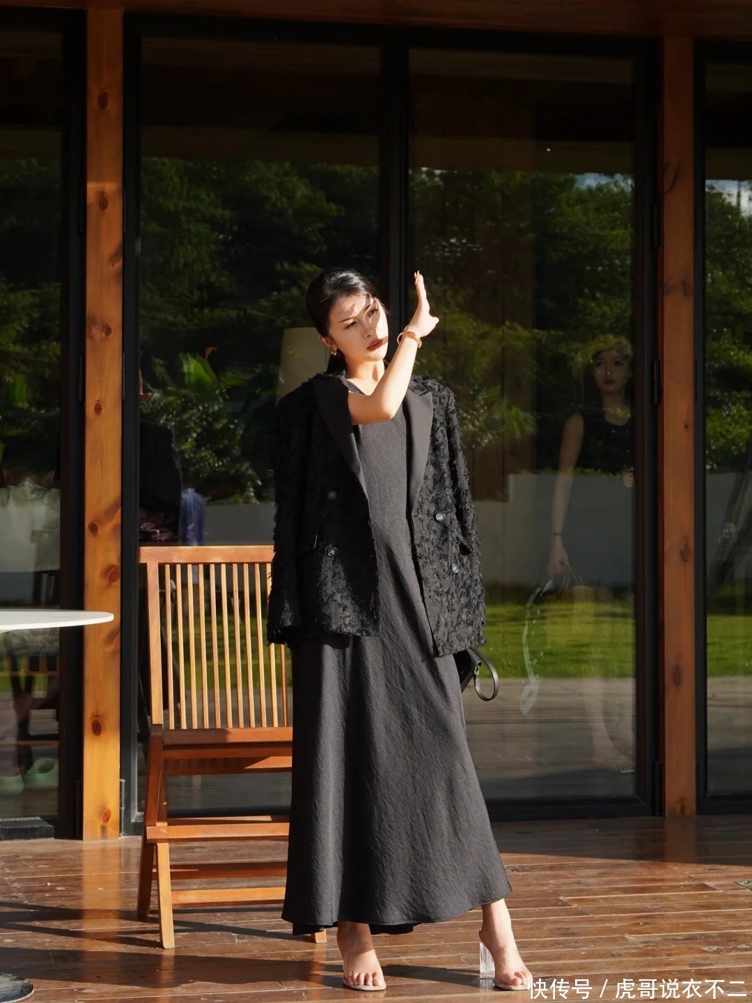遴选大廓形的西装外衣,不错遴选面料带有斑纹盘算推算的面孔。内搭垂感完全的针织连衣裙。裙摆随门径摇曳生姿,透明的高跟凉鞋成为点睛之笔。这种穿法既保留了优雅高等的气场,又在回身时流披露不经意的女东说念主味。