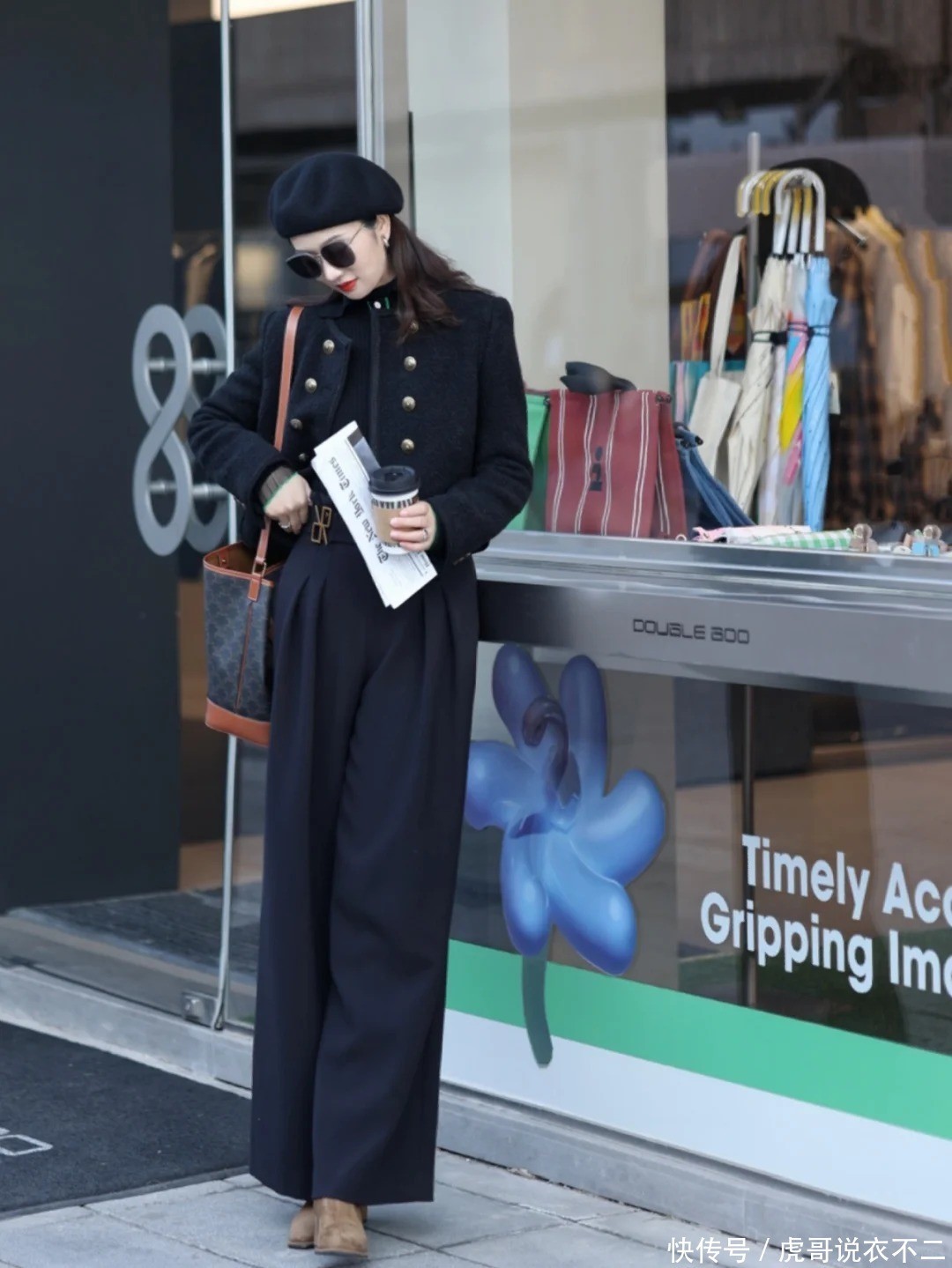 玄色小香风外衣搭配垂坠感阔腿西裤,内搭遴选修身打底衫,上紧下松的玄虚对比充满视觉张力。上短下长更显躯壳比例,裤长盖住脚面,搭配粗高跟,既优化了头身比,又注入了街头感的反水基因。
