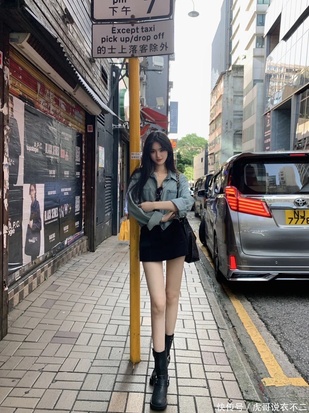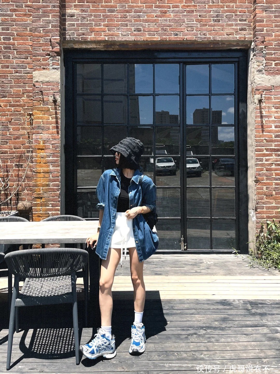 三、短裤/短裙:春夏露肤的显瘦轨则1、蓝色牛仔衬衫+玄色短裤:辣妹风进阶教程