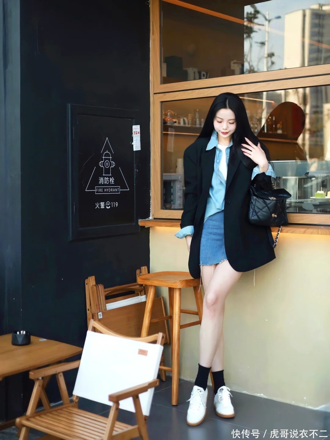 玄色西装内搭白色吊带,外搭浅蓝牛仔衬衫,下装选拔同色系牛仔短裙。驻扎表里衬衫长度差至少10cm,幸免肥壮。鞋履选拔从简的白色知晓鞋,恰到平正的配色减轻碎裂千里闷。