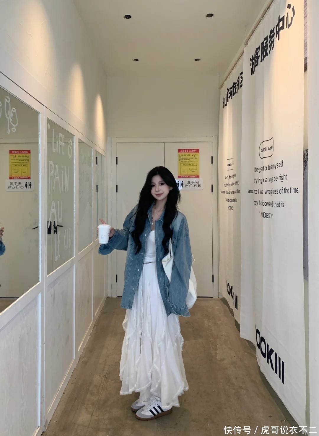 二、裙装搭配:可盐可甜的格调变奏曲1、牛仔衬衫+白色连衣裙:初恋感穿搭公式