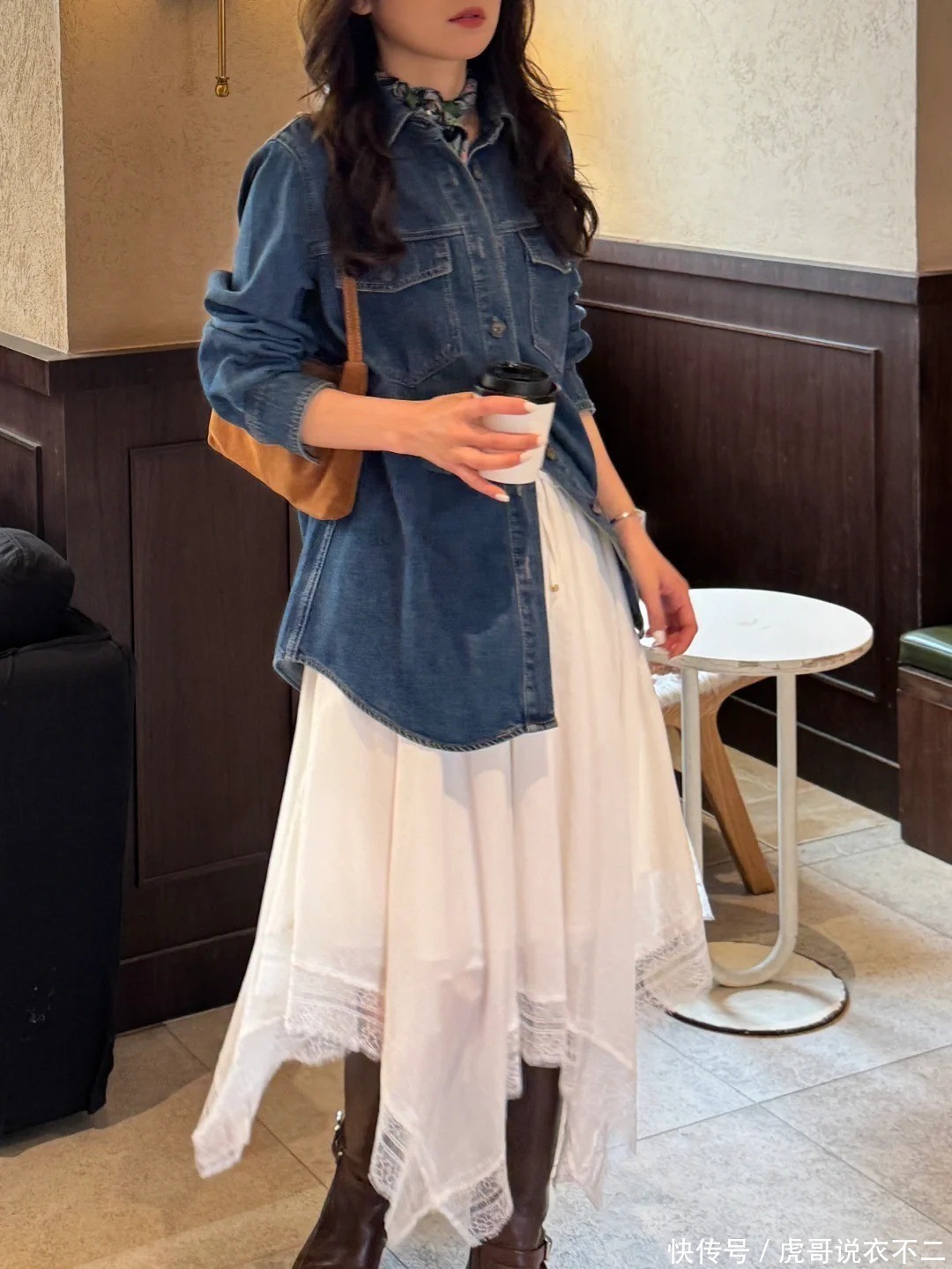3、牛仔衬衫+白色短裙:学院风穿搭