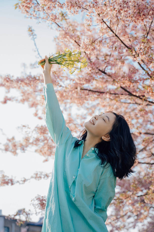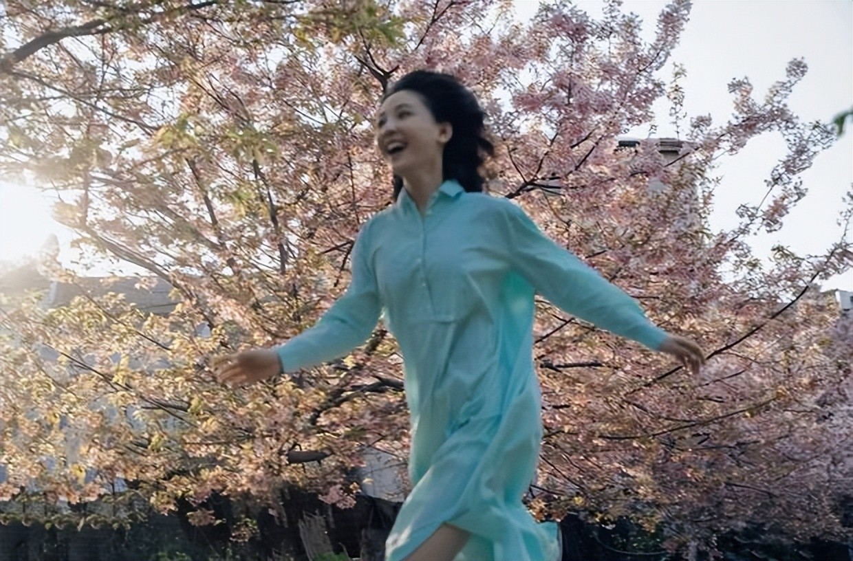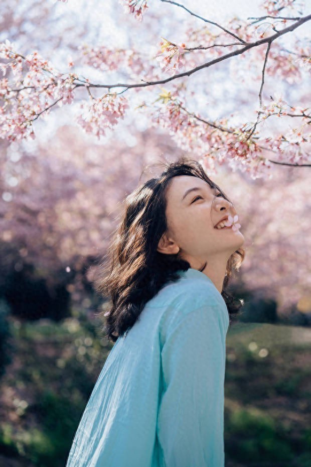 吴倩在樱花树下迎着阳光驰驱,充满人命力。