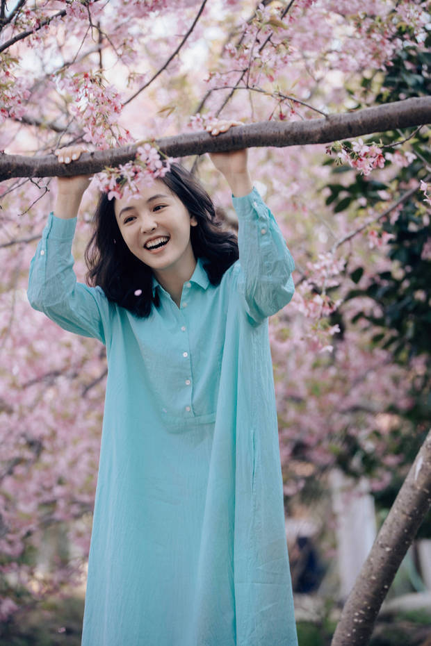 安福相册 吴倩时隔十年回武汉樱海 穿蓝裙甜好意思灵动