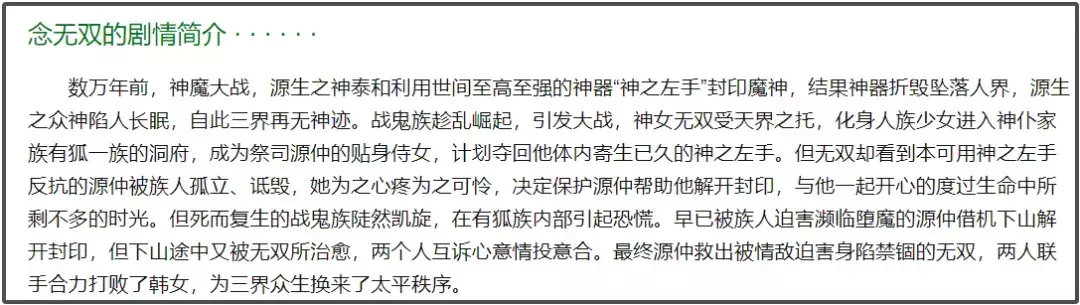 其实严格论起来,《念无双》剧情莫得大误差,但险些每一个情节总合计在其他古偶看过,倒不是说《念无双》抄袭,归根结底便是剧情陈腐,致使不错说有点土。