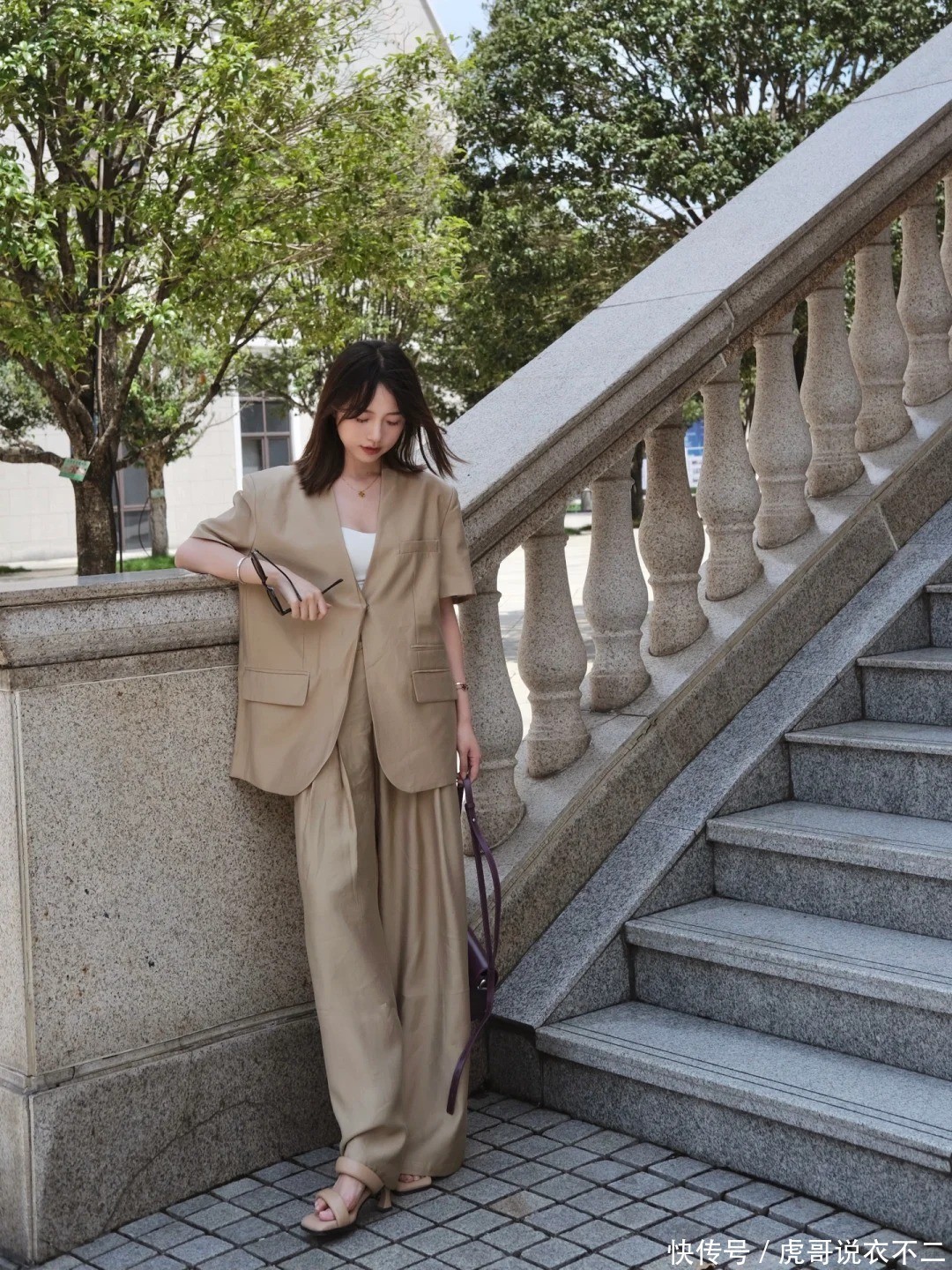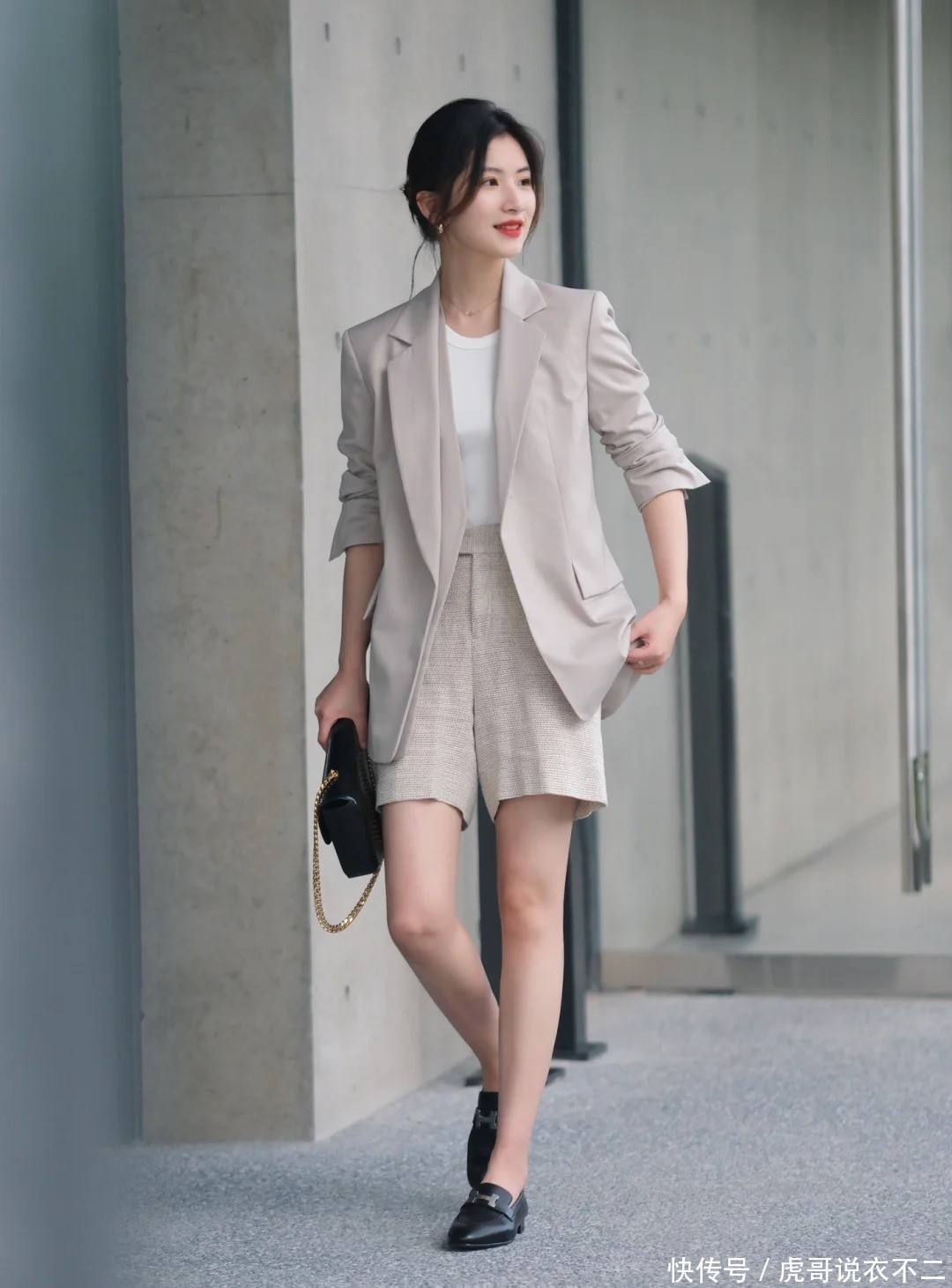 浅卡其西装搭配同色系短裤/短裙,内搭选拔白色T恤打底,检朴的配色就显得很高等。配饰选拔墨镜+棒球帽,包包一样保举玄色。让举座造型既有档次感又不失清冷感。