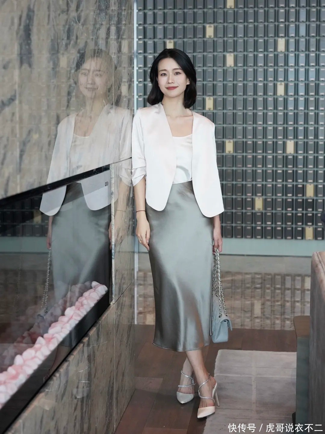 短款西装搭配缎面半裙时,内搭选拔同色系短背心,合适露腰的贪图让比例更优胜。记着:当西装偏万古,半裙长度以膝盖以上5cm为最好。