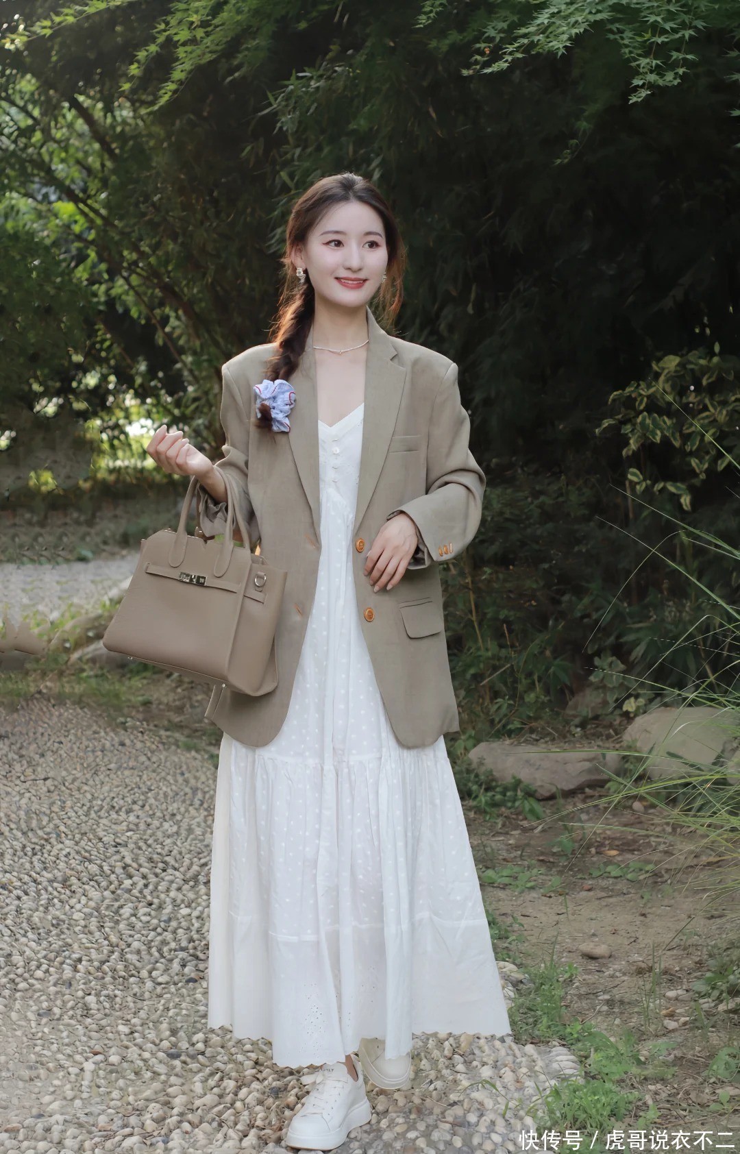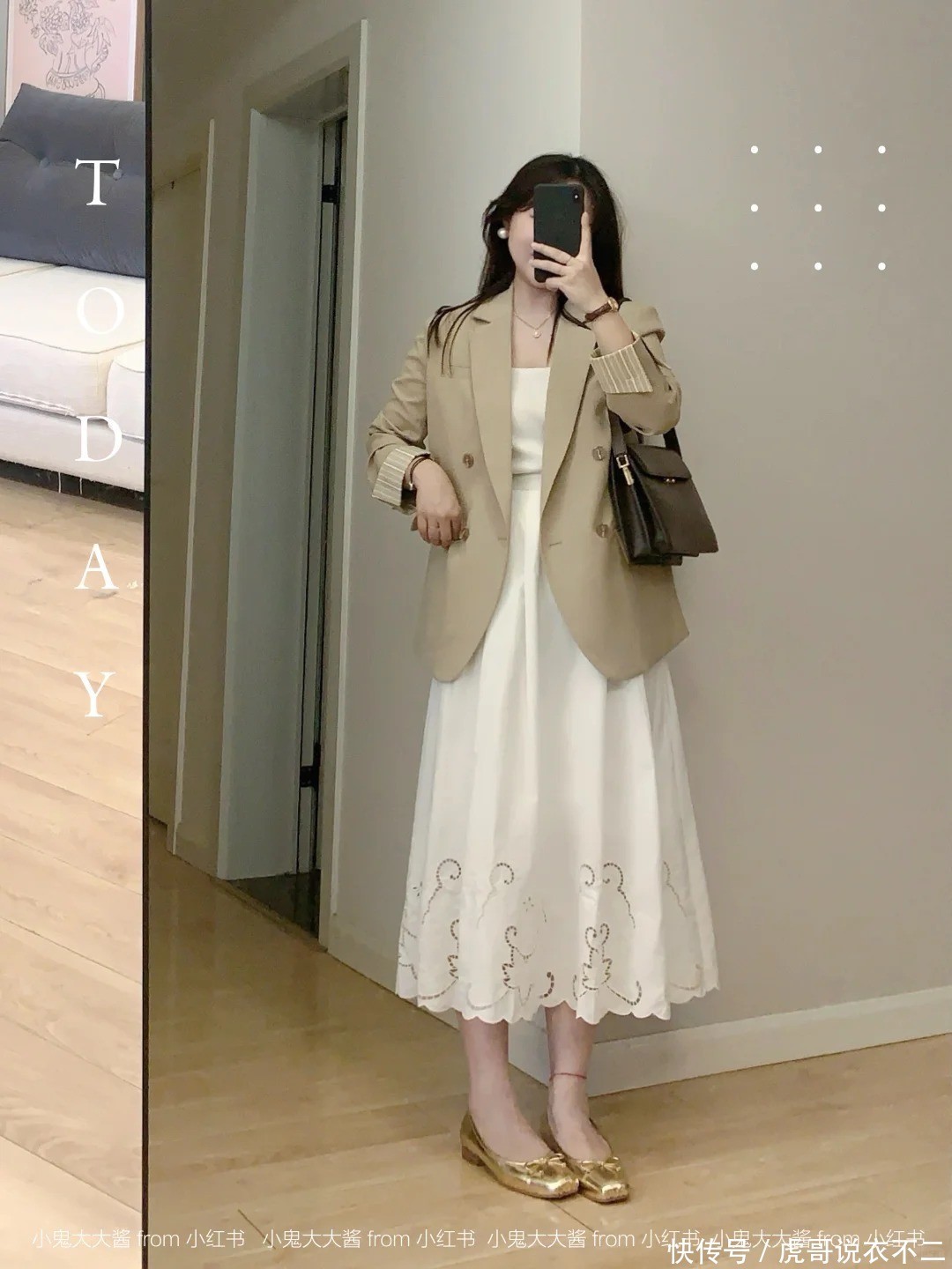 卡其色西装内搭白色茶歇裙,可搭配与西装同色的手挎包强调腰线,白色平底提示鞋,检朴高等,充满范例风情。