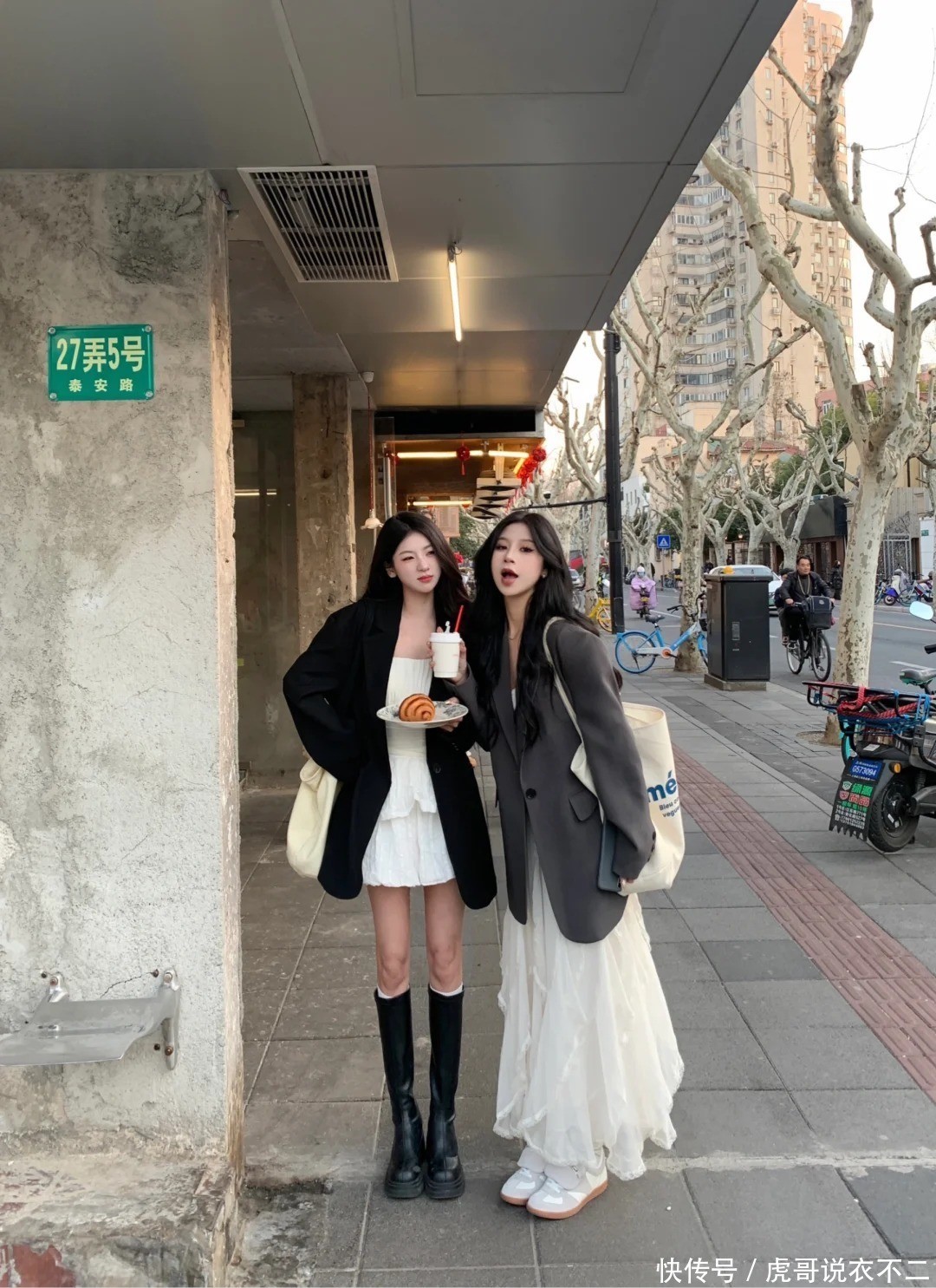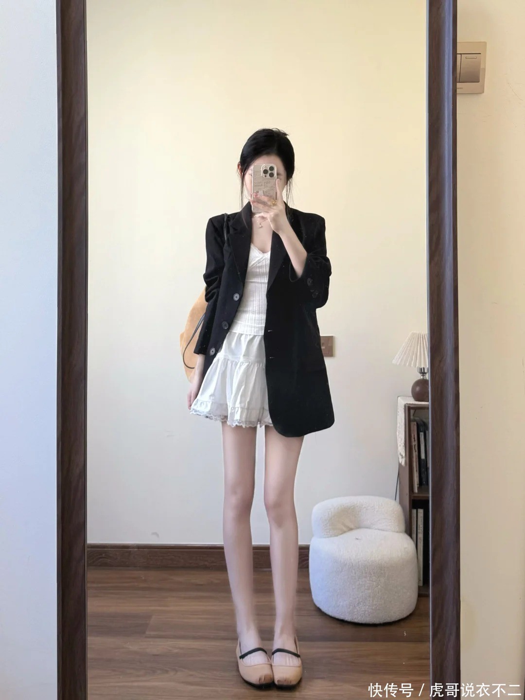 玄色廓形西装内搭白色吊带+A字短裙,外深内浅,遮肉显瘦完了尽头好,短裙的A字版型不但显瘦,还不错延伸腿部线条。这种"学院风+轻熟感"的混搭,尽头稳妥周末闺蜜下昼茶。