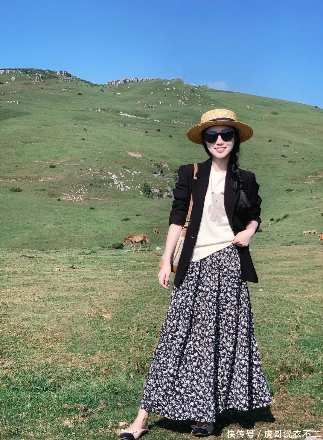 玄色小西装碰见碎花半裙,上简下繁的秩序让猖厥与利落并存。