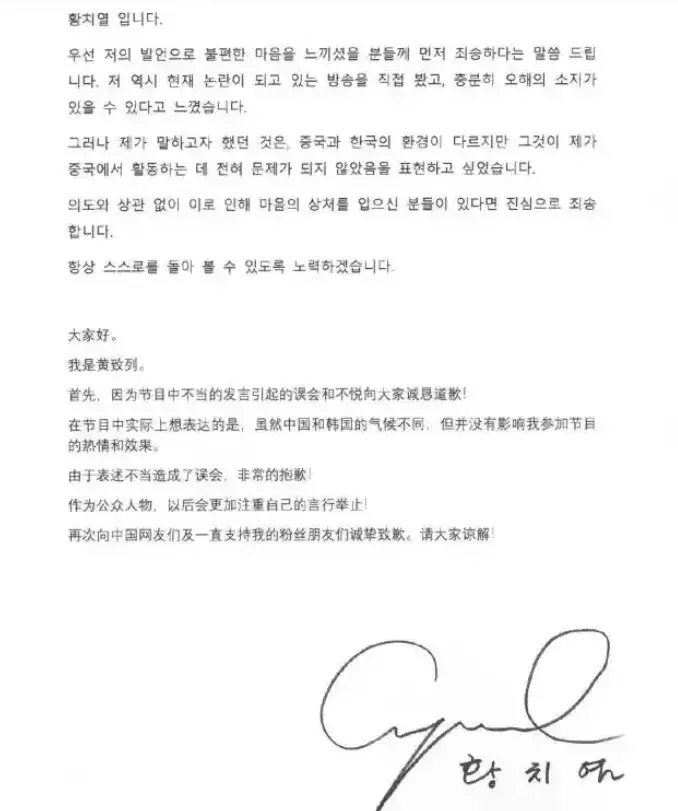 昔日黄致列干涉《我是歌手》受到热心,归国之后,流毒吐槽中国空气不好,哄笑似的在节目中爆料“中国钱好赚”。引来中国网友热烈不悦,意志到说错话之后,不肯意断念中国商场的他速即谈歉。