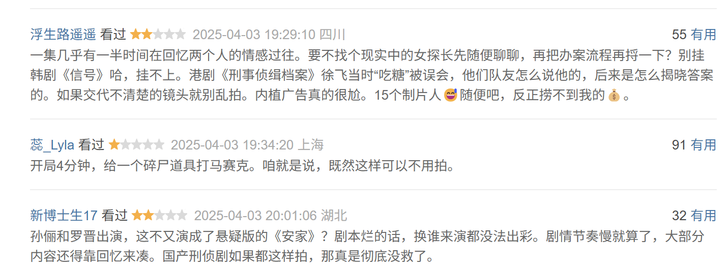这就不怪有不雅众差评“这不又演成了悬疑版的《安家》?脚本烂的话,换谁来演王人没法出彩。脚本节律慢就算了,大部安分容还得靠回忆来凑。国产刑侦剧要是王人这么拍,那确实绝对没救了。”