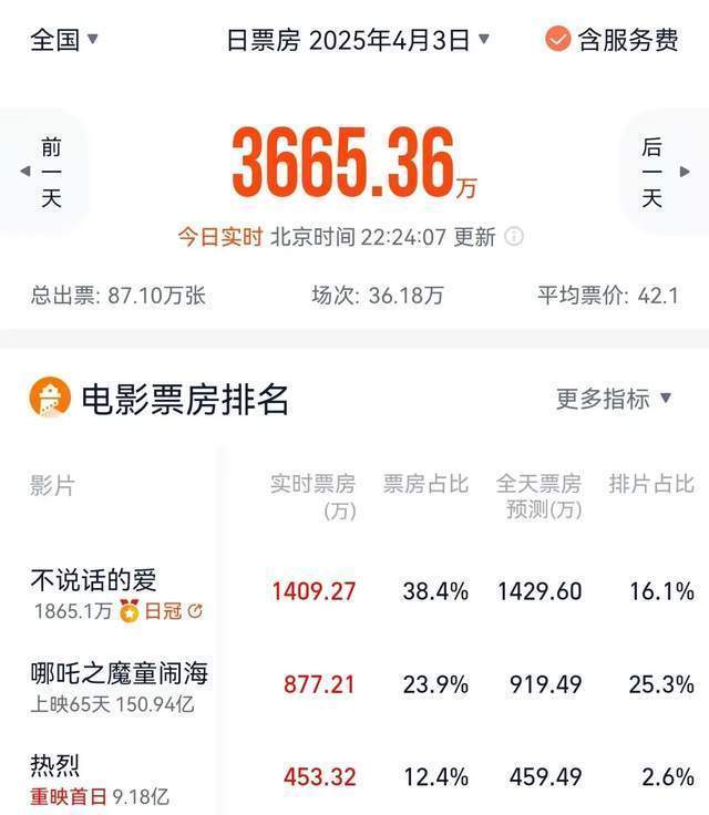 诚然莫得一部电影未必恒久是票房冠军,哪吒书写的这段别传也朝夕会终结。不雅众也更乐见解到好的电影市集陆续有着正向轮回,有着联翩而至的新片好作品上映带给公共。仅仅叫东谈主可惜的方位在于,第又名《不语言的爱》也莫得获取炸裂的票房适度,休假前一天在不少新片齐跟公共碰头的情况下,凑在沿路也即是单日票房3665.36万,想起那段时分《哪吒之魔童闹海》一部一天就好几亿,中国电影市集这才是回落到了平常场合。