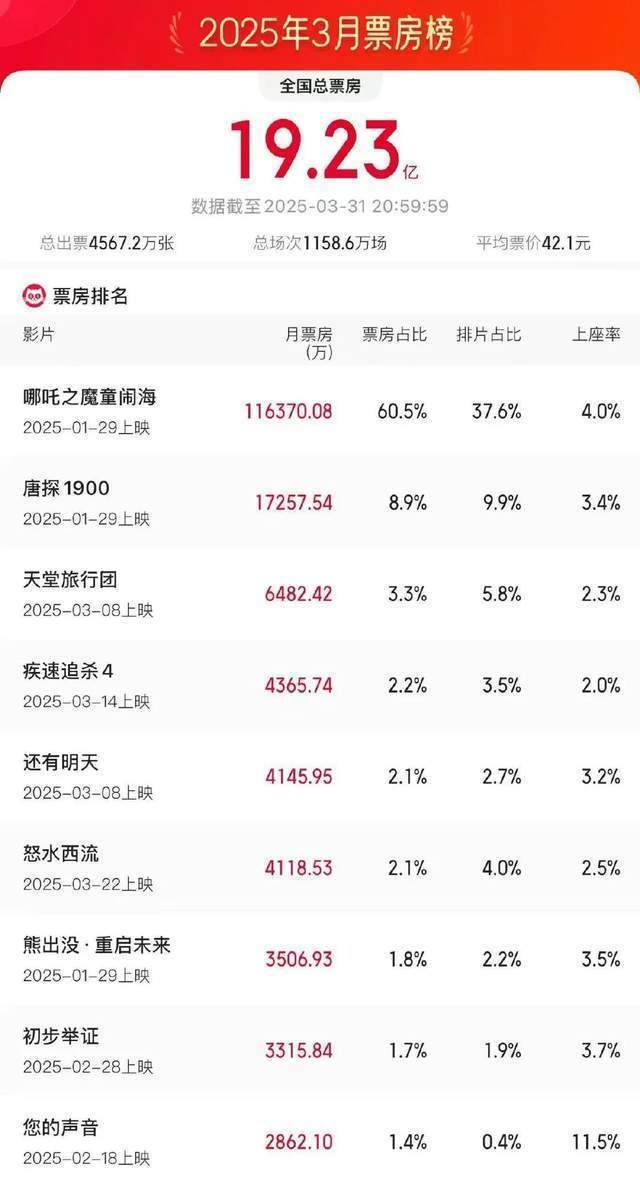 精致完了春节假期的3月,总票房19.23亿,《哪吒之魔童闹海》一部11.6亿。3月的终末一天,《哪吒之魔童闹海》664万,较单日12.3亿峰值,已不行同日而谈。其余上映的新片《疾速追杀4》、《好意思国队长4》、《白雪公主》等轮替填旋,3月票房榜齐够不着,头部断层严重。
