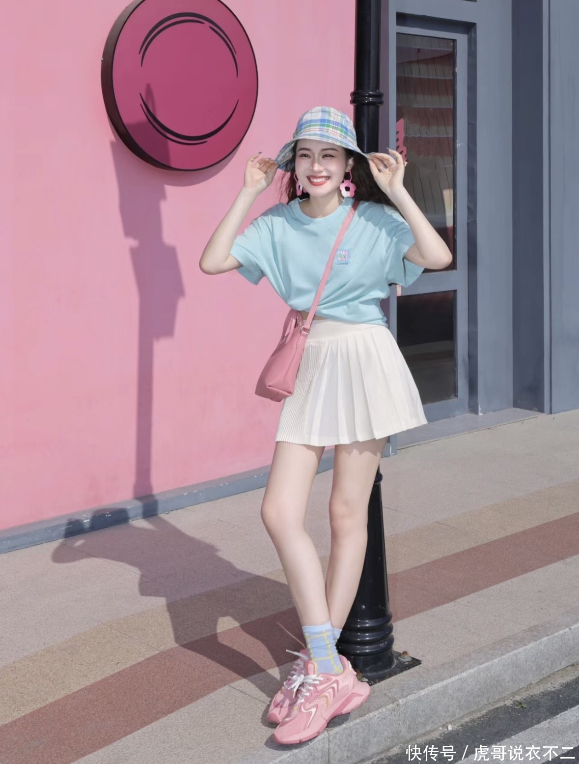 当浅绿色T恤碰见白色百褶裙,极具青娥感的穿搭,粉色斜挎包和粉色阐发鞋相呼应,这么的穿搭出行游玩十足是一齐靓丽的模式。