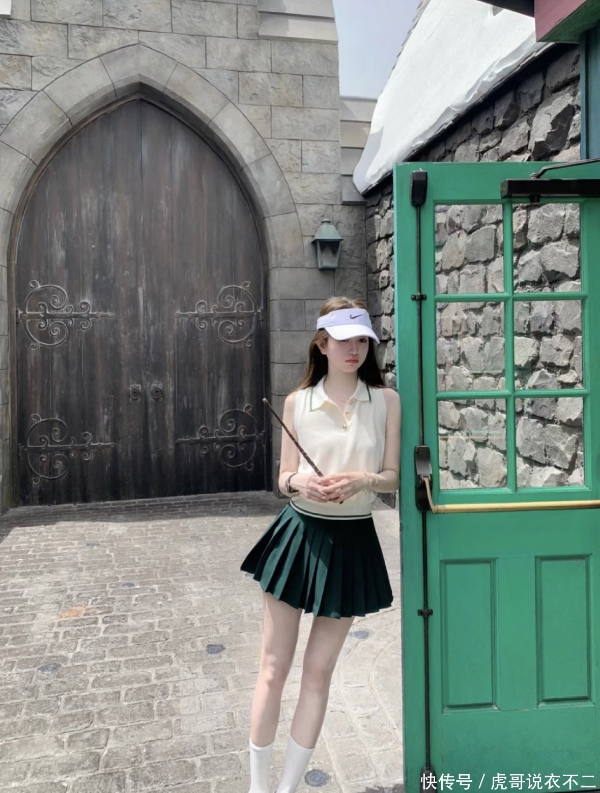 无袖POLO衫+百褶短裙,米色与绿色的碰撞,充满了祈望与活力,仿佛在告诉你,夏天仍是到来。