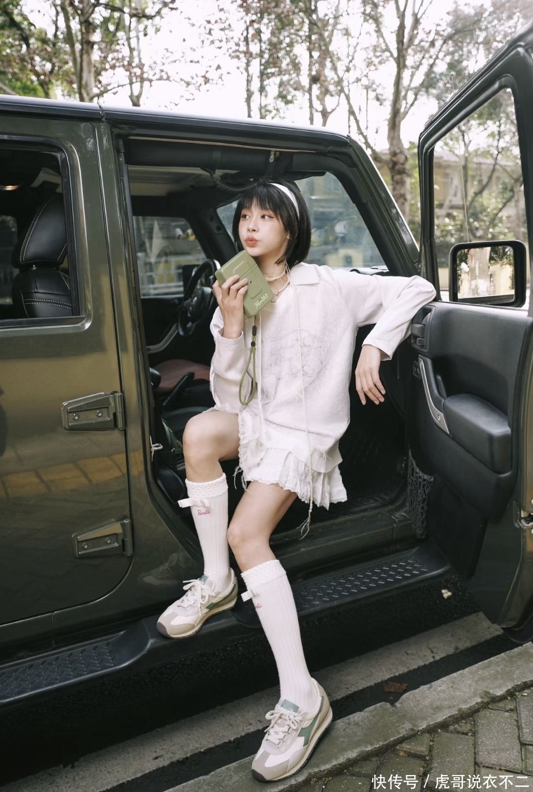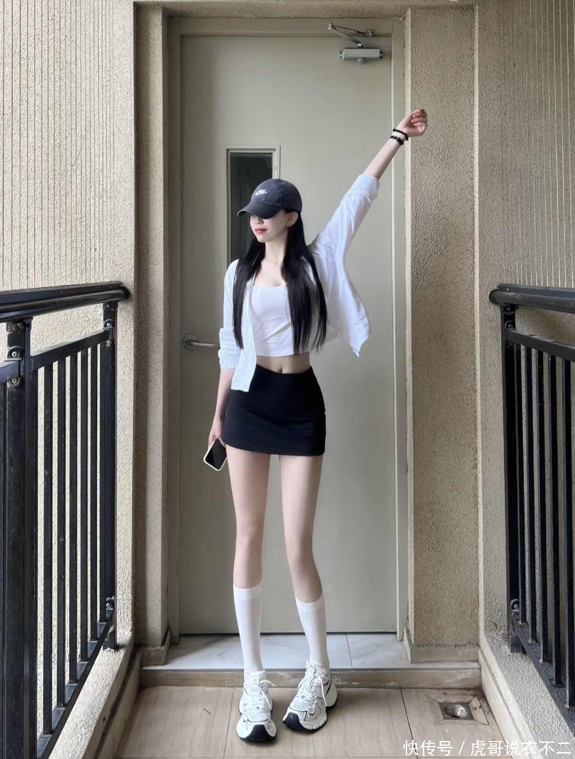长筒袜必须要与短裙短裤搭配,才更能突显腿长,玄色包臀短裙+白色长筒袜配阐发鞋,上衣的贯透风短卫衣+背心,相当肤浅的贯透风混搭,文雅减龄又显肉体。
