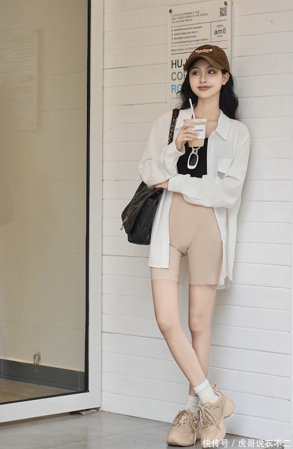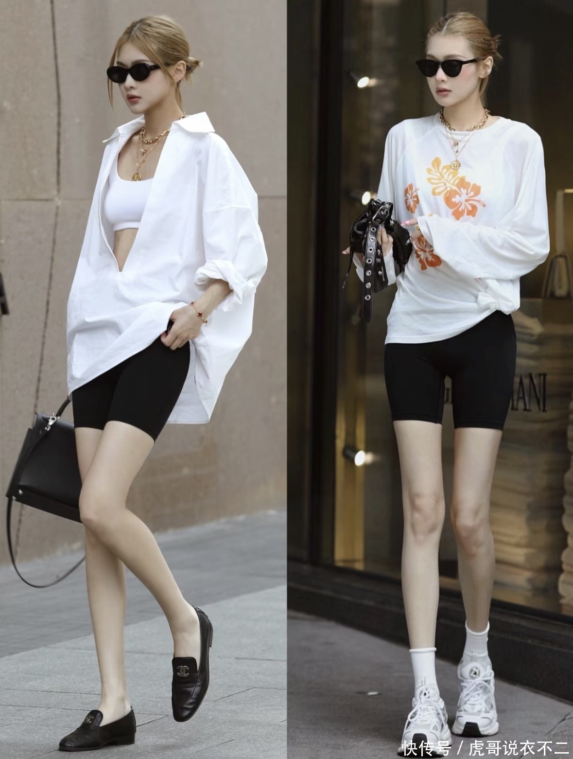 骑行短裤还可以搭配男友风衬衫+背心来穿,既能遮肉显瘦,又能突显高腰线,从而让肉体比例愈加好意思满。