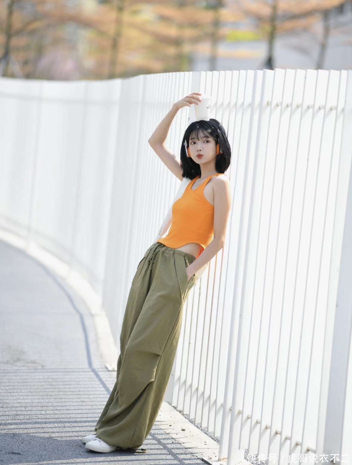 初夏日节,亮堂的橙黄色可以给造型带来更多的祈望与活力,橙黄色背心搭配军绿色贯透风束腿裤,上窄下宽、上短下长的穿搭,就算是梨形肉体也能糟塌独霸,这个初夏作念个酷帅的女孩。