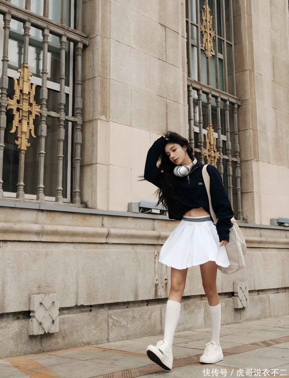 短款露脐卫衣+百褶裙,好意思式穿搭中相对更稳当国东说念主的一种搭配面孔,飘溢着芳华活力,亦然如今三街六巷非常常见的搭配之一。