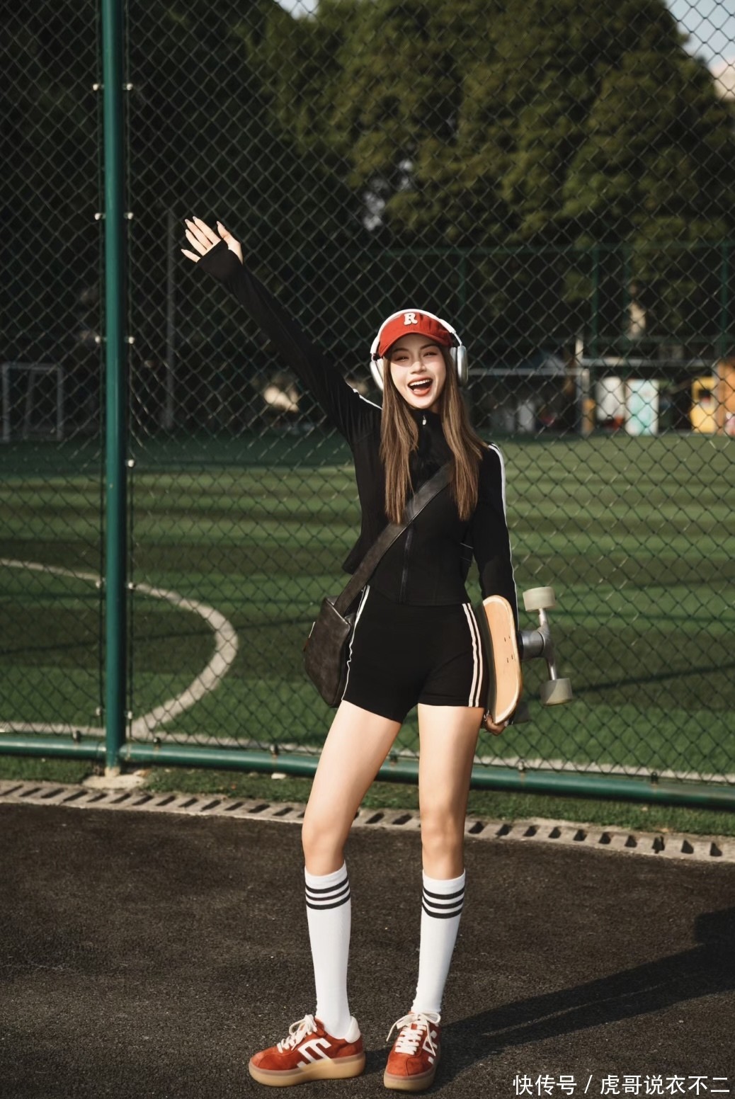 玄色贯透风短裤套装,白色条纹长筒袜配红色阐发鞋,红色棒球帽颜色相呼应,全脸颜色搭配相当的散漫,带着小数酷炫又不失俏皮感。