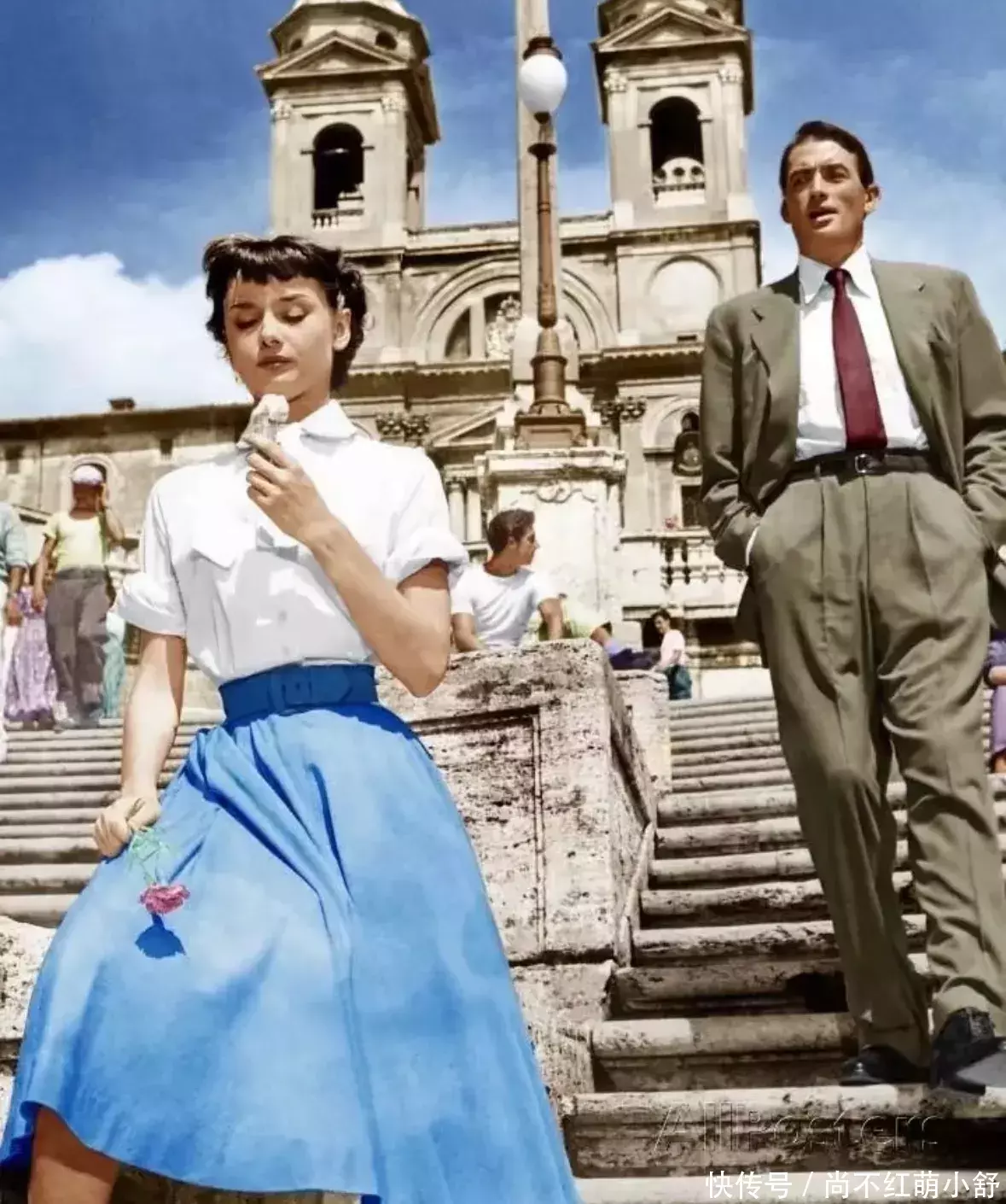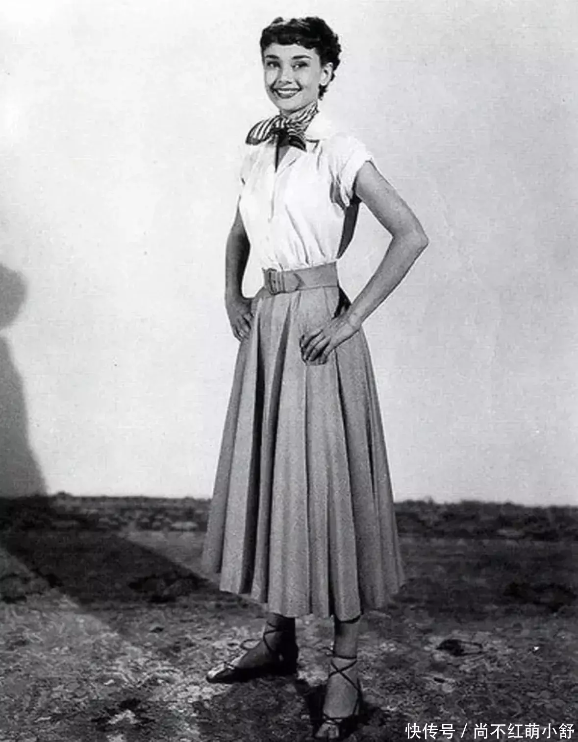 1953年赫本在《罗马沐日》,身着好像白衬衫,袖口放纵卷起,搭配高腰伞裙,丝巾与平底鞋点缀,骑着Vespa穿梭于罗马街头,诠释了“less is more”的好意思学真理。