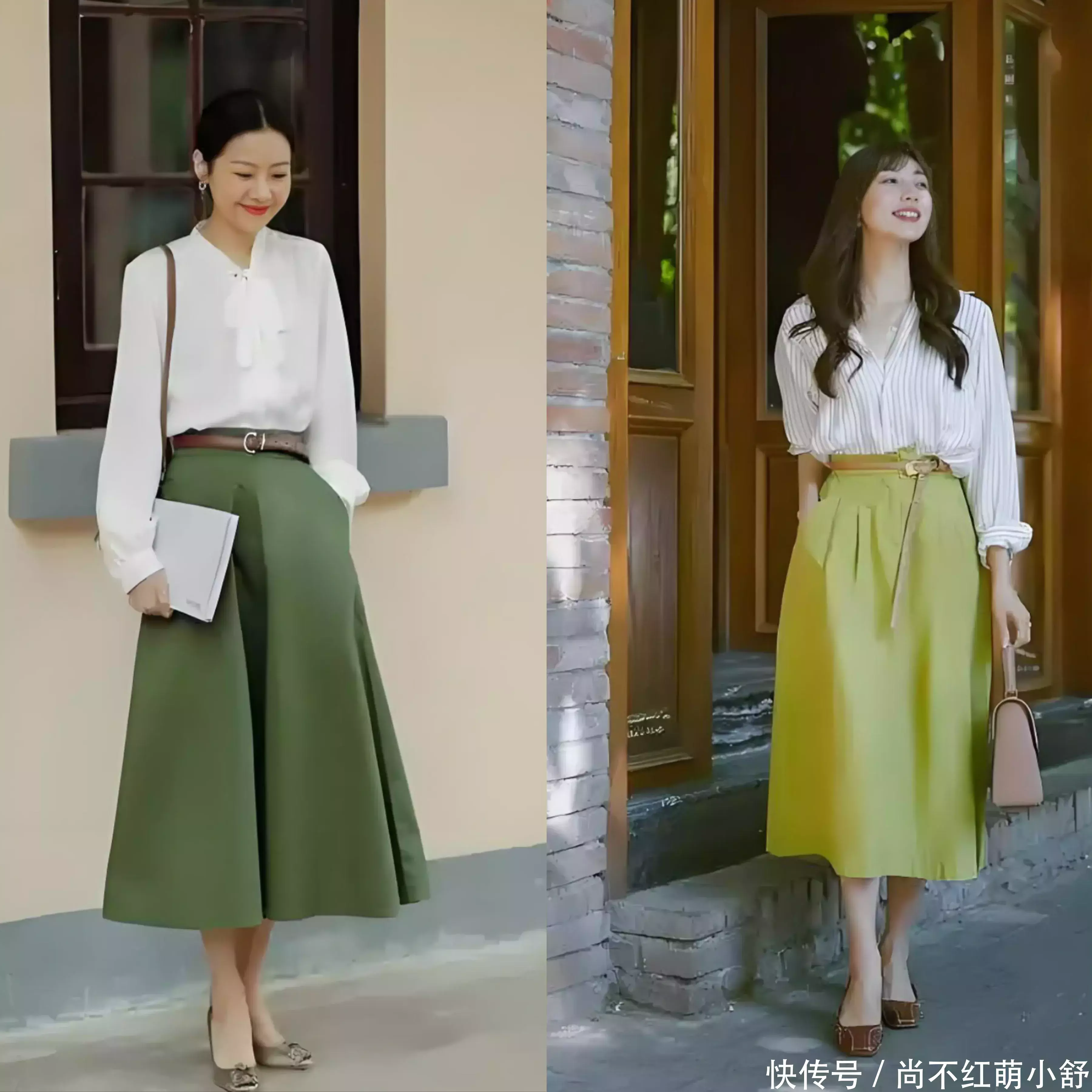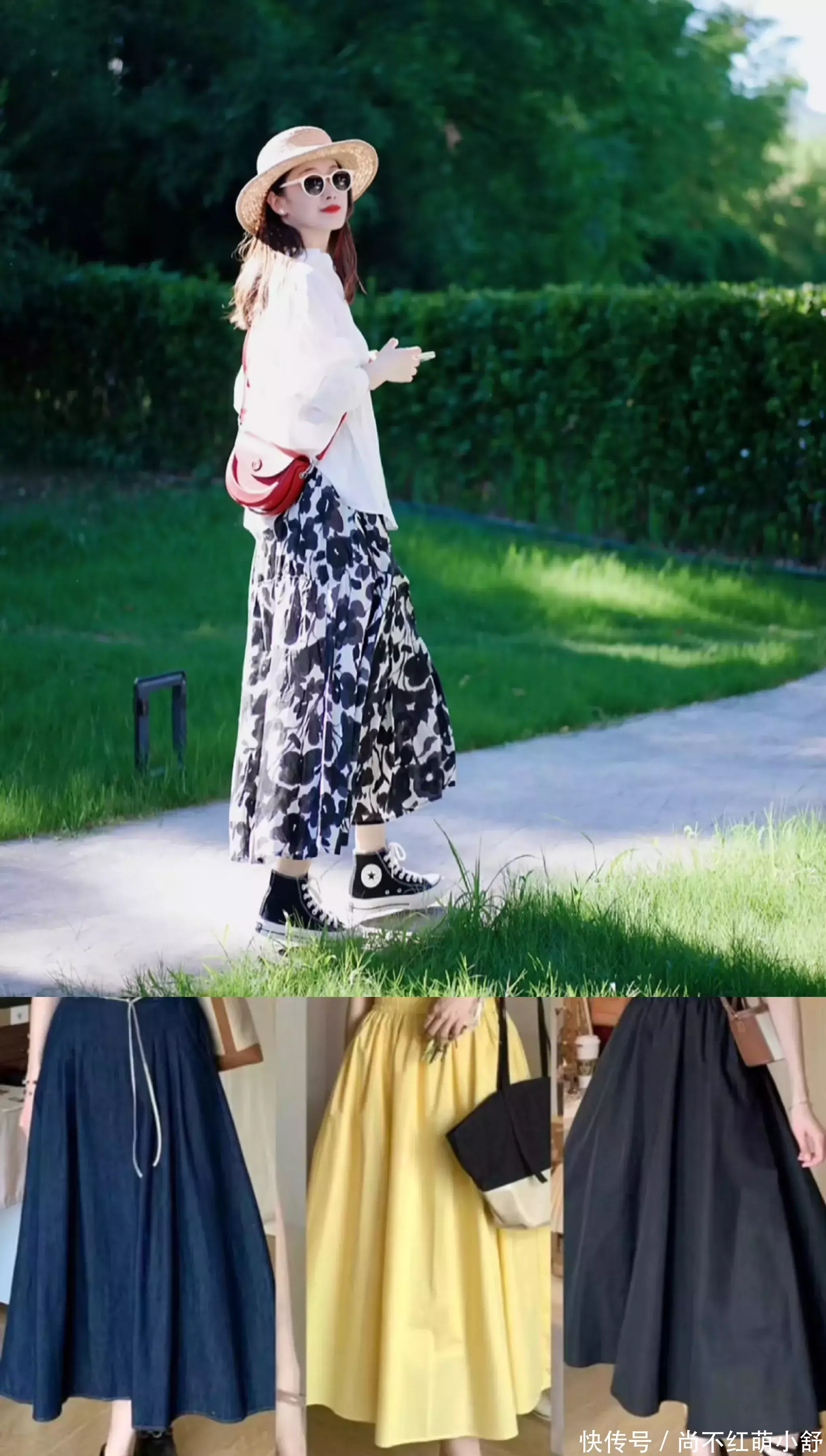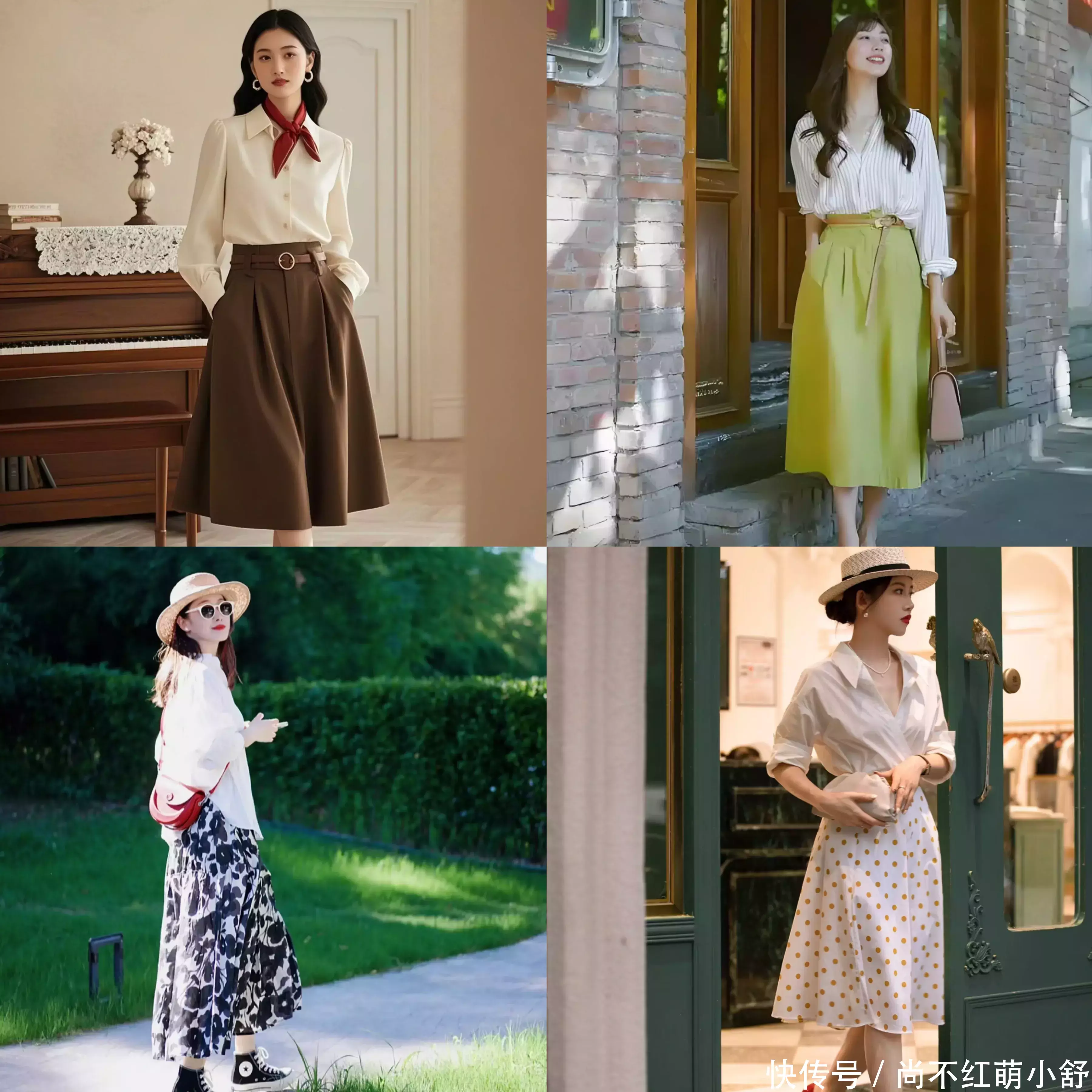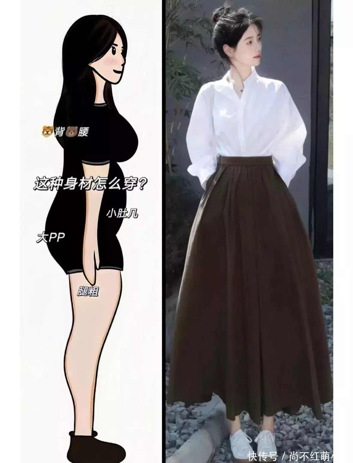 避雷3)身段适配:梨形身段多接收A字伞裙(胯部不外分扩展)。苹果型身段衬衫下摆接收当然垂落,搭配深色伞裙会更修饰身段。