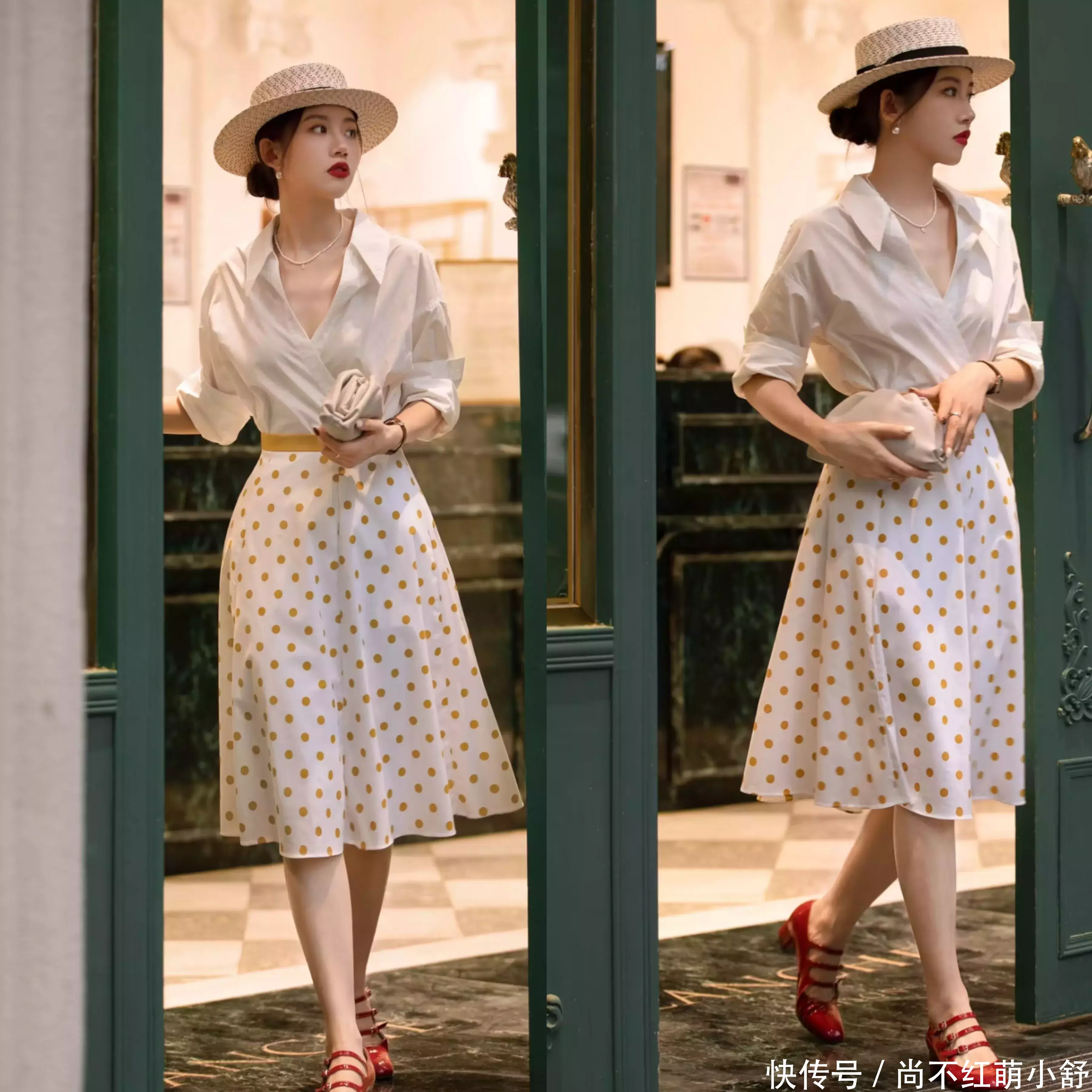 宽松白衬衫(解开2-3颗扣子)+ 波点/碎花伞裙 + 包包 + 平底凉鞋或者高跟鞋,慵懒又优雅文静。