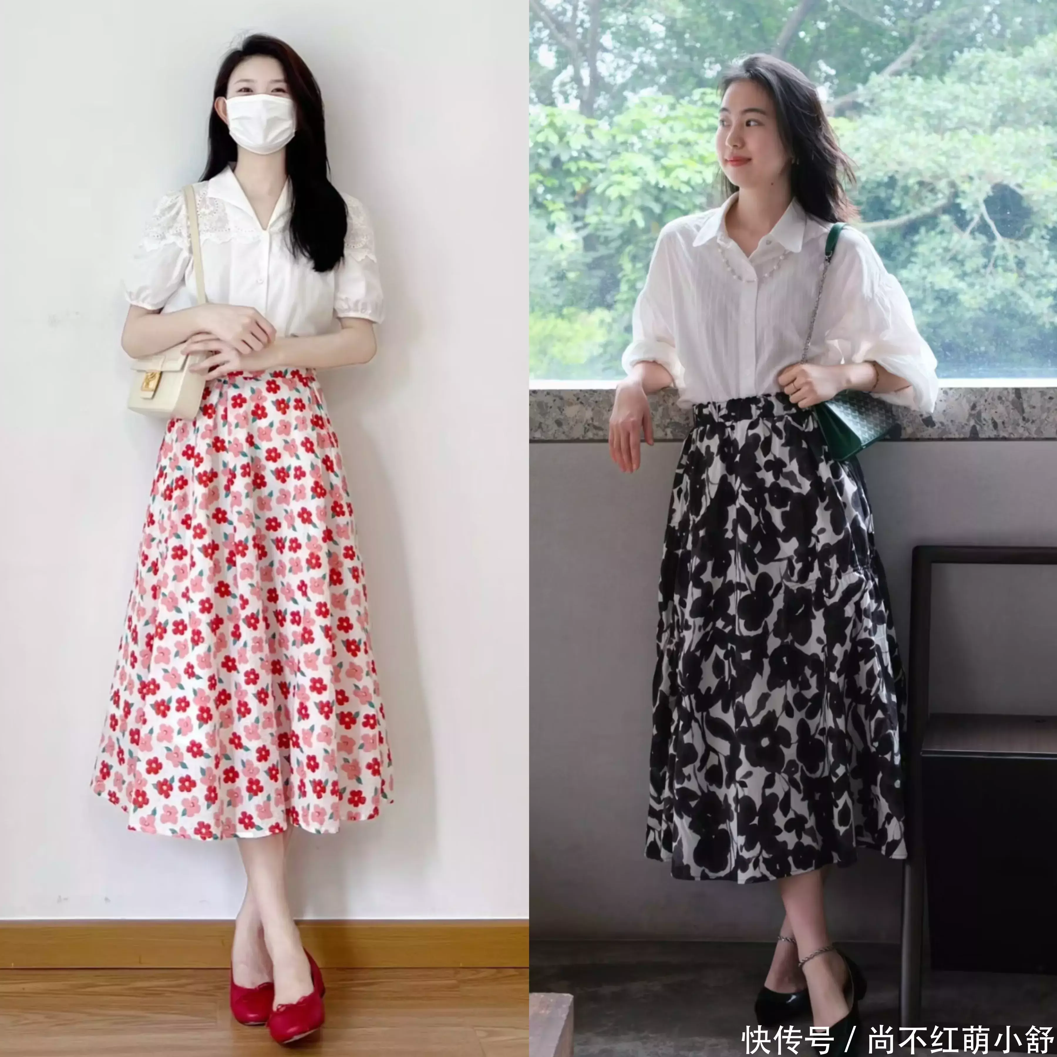 搭配妙技:广阔感的女性接收大碎花,小量感的女性接收小碎花,衬衫塞在裙子里,搭配同色系的包包,文静又气质。