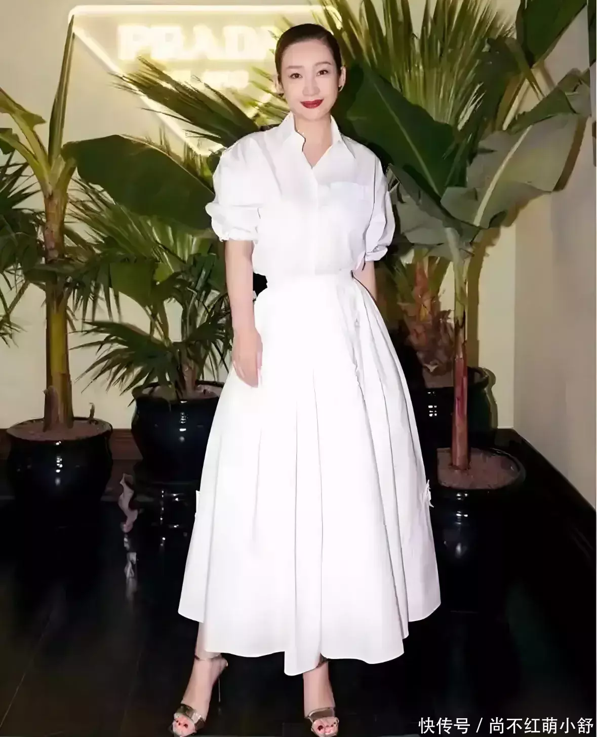 秦海璐以挺括白衬衫搭配同微弱伞裙,搭配双高跟鞋,用腰带强化腰线,致密配饰展现“柔中带刚”的当代女性气质。