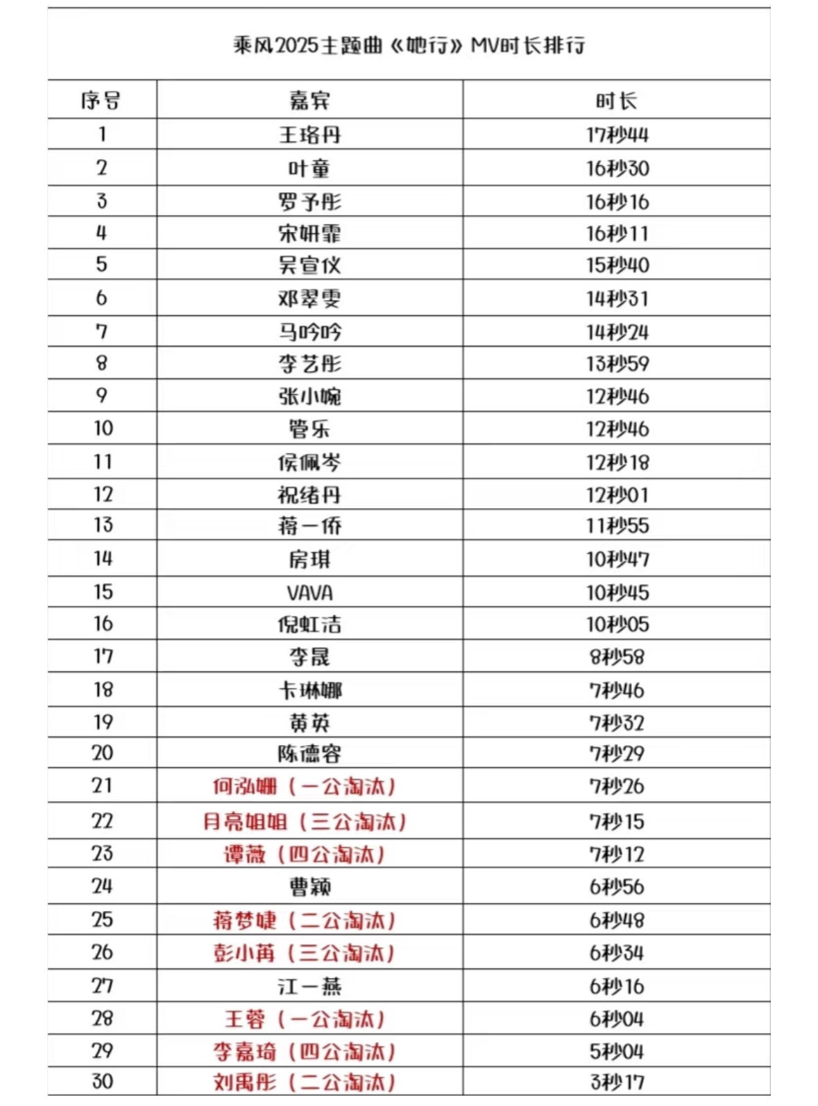近日,网友们对《乘风2025》主题曲《她行》MV时前程行统计,咱们不错发现:王珞丹、叶童、罗予彤、宋妍霏、吴宣仪的镜头时长是比较多的,她们是妙手气姐姐,这是极端平常的事情,但看到镜头时长排行靠后的姐姐,网友们不淡定了。