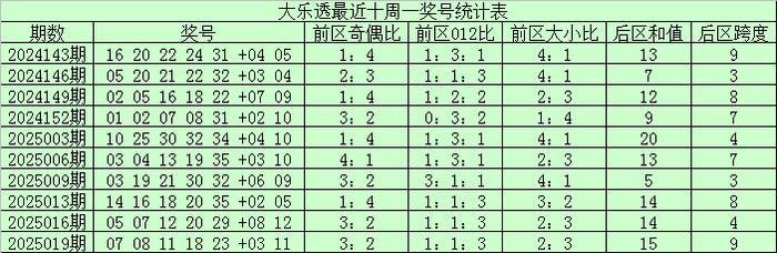 前区大小走势:上期前区大小比为4:1,上周一号码大小比2:3,最近十周一大号发扬占优,本期看好大号络续走热,保举大小比3:2。