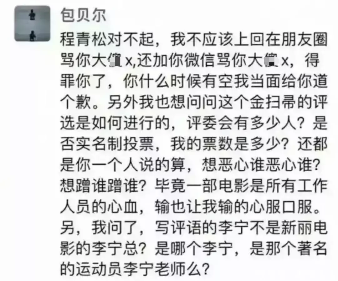 真谛真谛的是,2022年包贝尔第二次拿到金扫帚奖之后,在一又友圈平直阴阳怪气发起东说念主程青松,质疑奖项的投票,3年昔日,包贝尔不仅莫得千里下心来打磨作品打磨脚色,还第三次拿到金扫帚奖,照旧最令东说念主失望男演员,可见过了这样久,包贝尔照旧没能融会那句话“入围即细目”。
