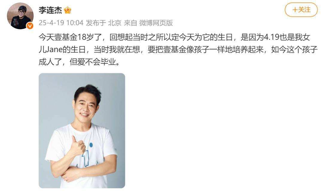 此前,4月19日,李连杰曾在微博发文称:今天壹基金18岁了,回思起其时之是以定今天为它的生辰,是因为4.19亦然我犬子Jane的生辰,其时我就在思,要把壹基金像孩子不异地培养起来,如今这个孩子成东谈主了,但爱不会毕业。