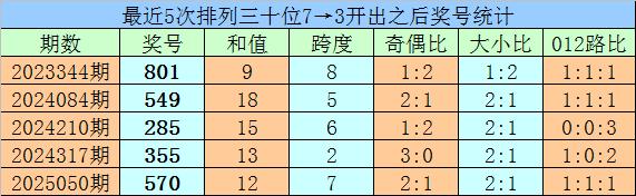 1、最近两期胪列三十位号码开出号码区分为7和3,历史上十位号码勾通两期同期出现号码7和3的奖号共开出68期。最近五次下期开出号码为:801、549、285、355、570;