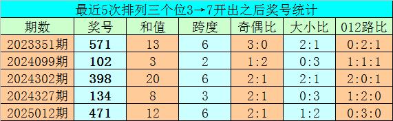 1、胪列三前两期个位区分开出号码3和7,历史上个位号码勾通两期区分出现3和7时,共有70次。在最近5次出刻下,其下期区分出现号码:571、102、398、134、471;