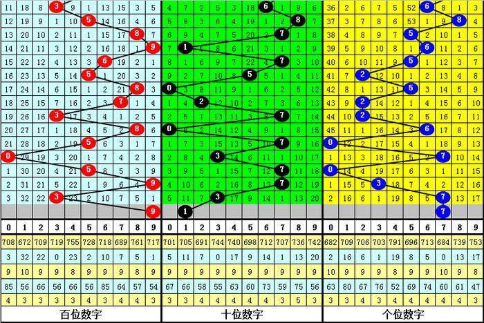 3、在以上0-9号码频次中,号码大小比为33:42,012路比为33:16:26,本期展望百位开出0路号码,参考号码9。