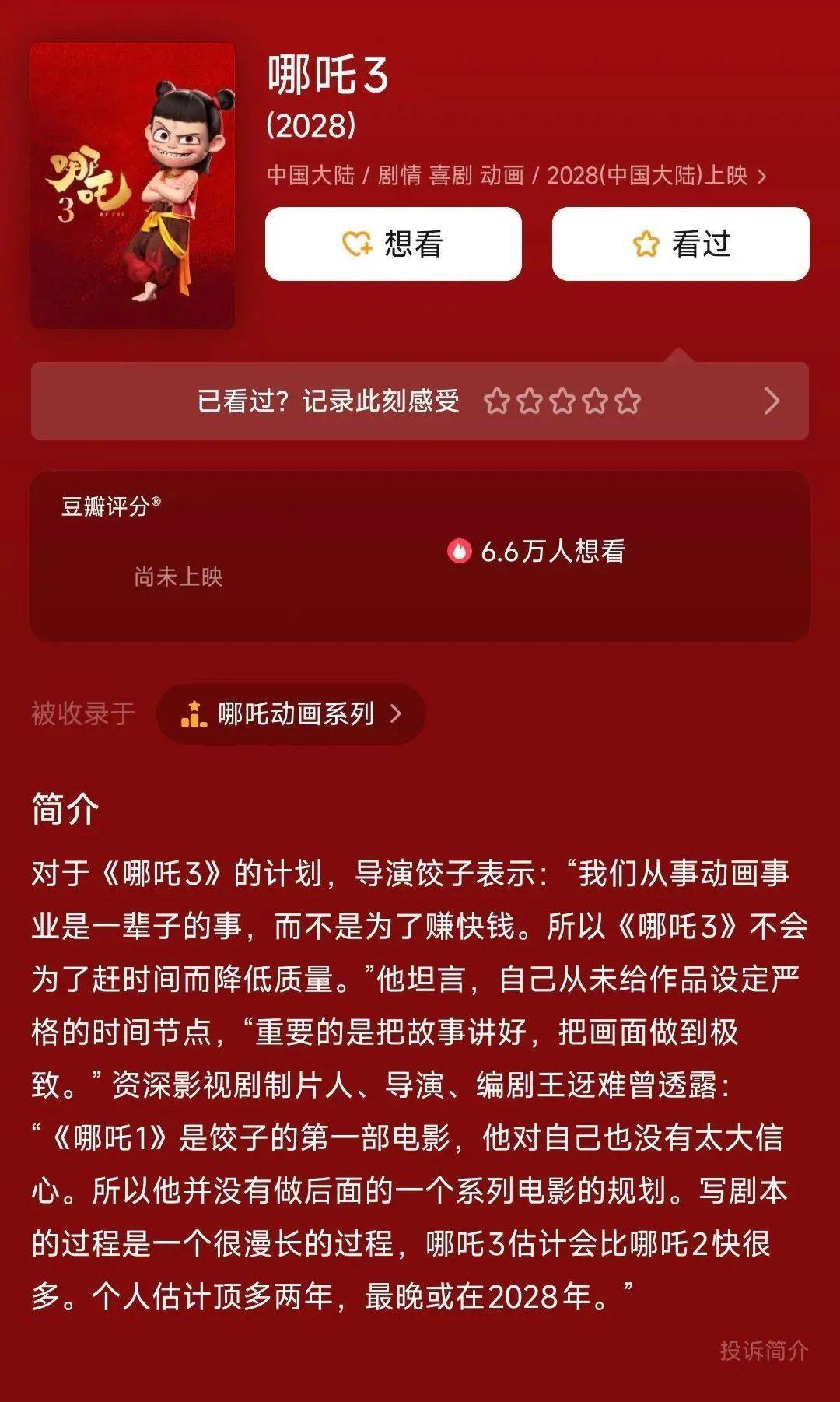 豆瓣App自大,《哪吒3》上映本领目下备注为2028年。