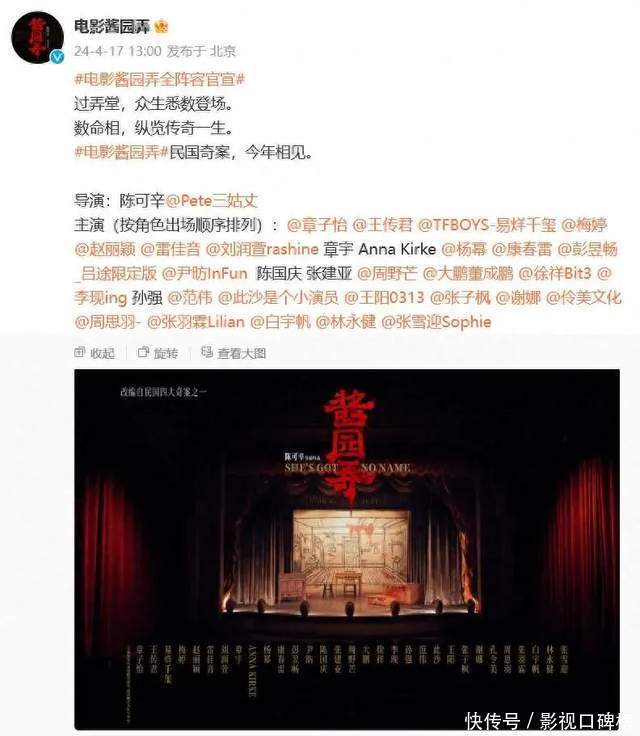 电影《酱园弄》由陈可辛捏导,章子怡主演。该剧组发文称:本年再会!这个音讯一出后,引起了许多不雅众们的期待。