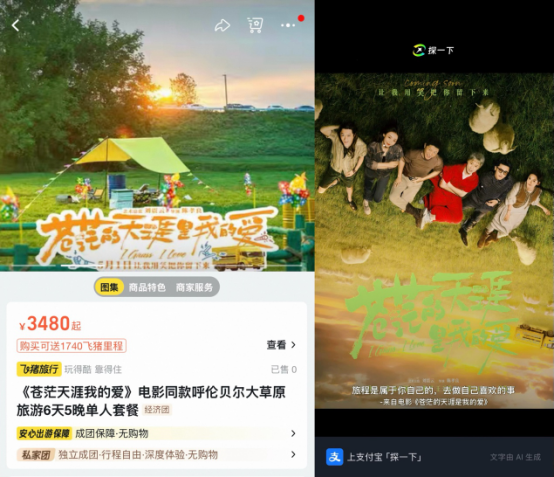 此外,五一假期将至,阿里影业合力集团生态业务深挖影片背后的文旅价值。其中,淘票票筹备飞猪共同配置了“随着电影去旅行”《茫乎的海角是我的爱》旅行专线,推出“世界多地飞内蒙古”、“电影同款呼伦贝尔草原6天5晚”、“内蒙古红石崖火山草原5天4晚”等定制化电影旅游产物。同期,淘票票还筹备支付宝“探一下”功能,为影片相等定制了可一键生成的电影同款旅行滤镜,依托“AI技能”让电影与旅行愈加情味横生、互通互融。