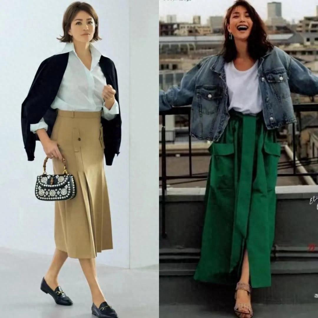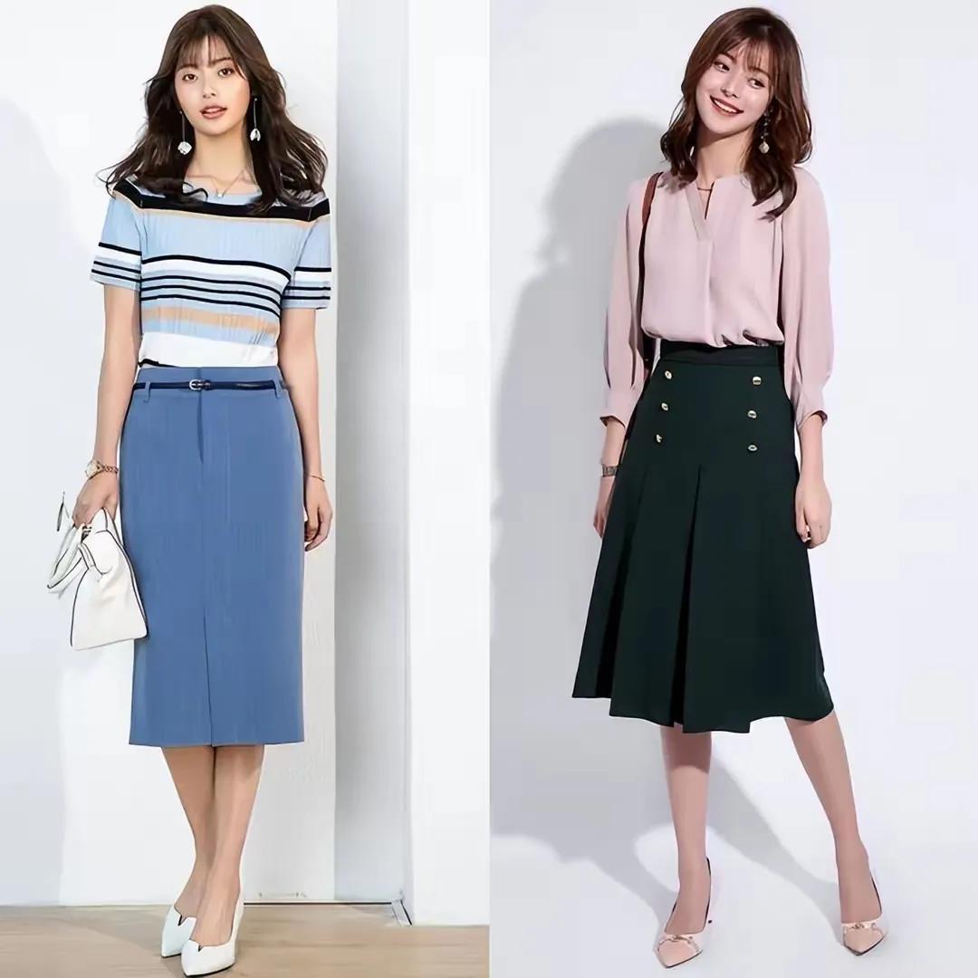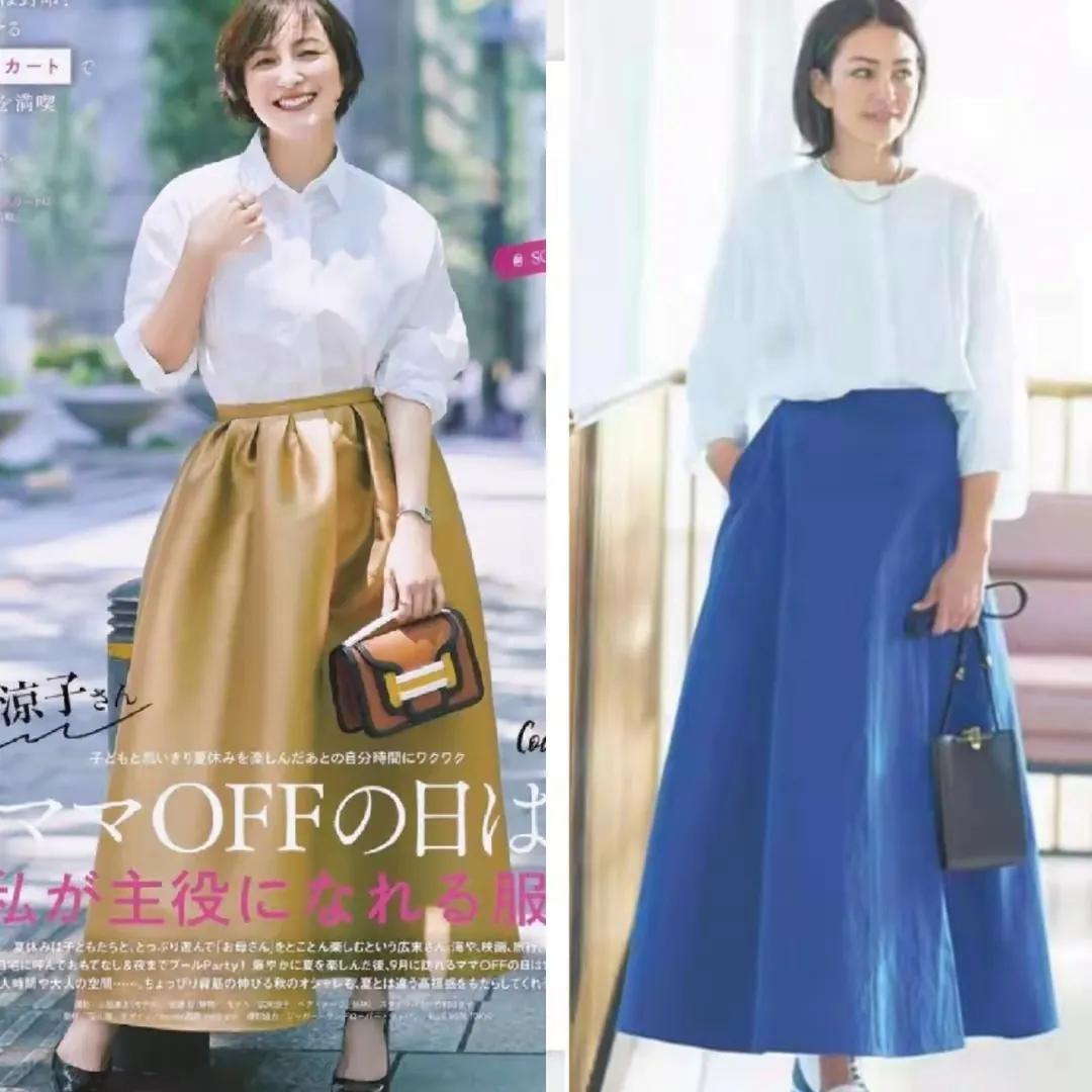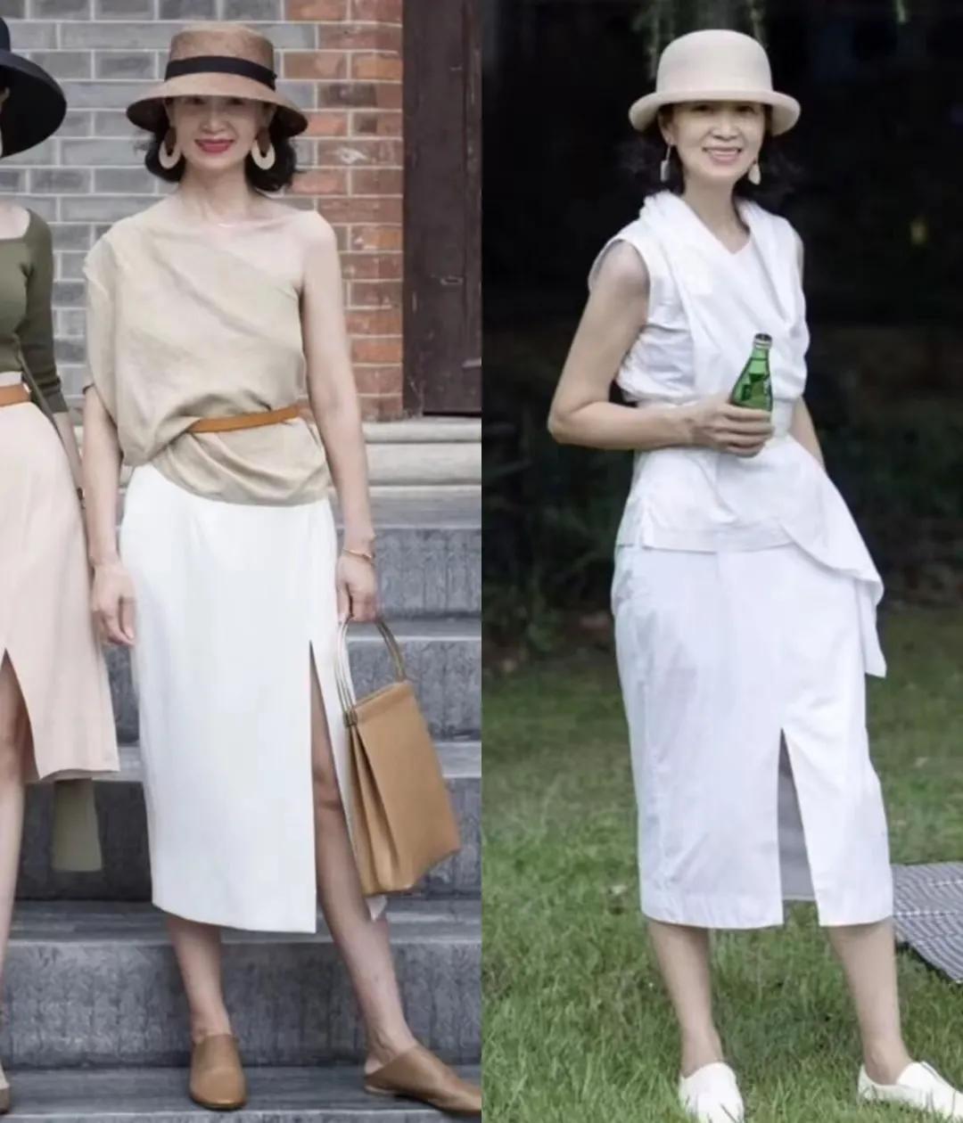 不外无论选择哪一种穿搭方式,皆要念念方设法的去擢升你的腰线,比如说你用衬衫上衣搭配上半身裙,你可以把衬衫塞进裙子内部来擢升腰线。或者像底下这位中年女性一样,用一款小小的腰带来点缀,不光可以擢升腰线,又能勒住小蛮腰,可以说是一举两得。