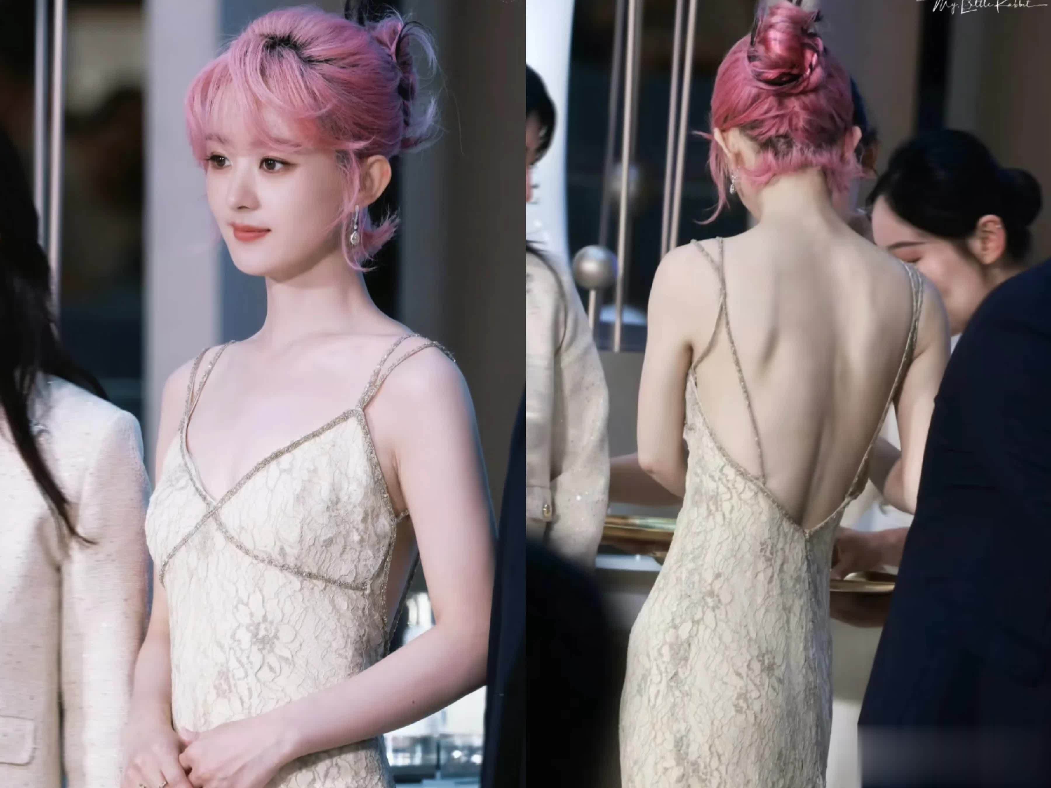粉色短发搭配淡黄色露背长裙,看起来情状极度可以,似乎并莫得被新恋情的公论影响到。