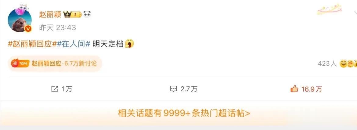 赵丽颖随后硬刚:蹭一个渣浪给的热搜,《在东说念主间》要定档了。