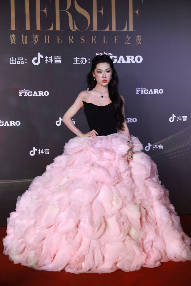 迪士尼在逃公主一袭粉色花朵蓬蓬裙登场,又好意思又酷。