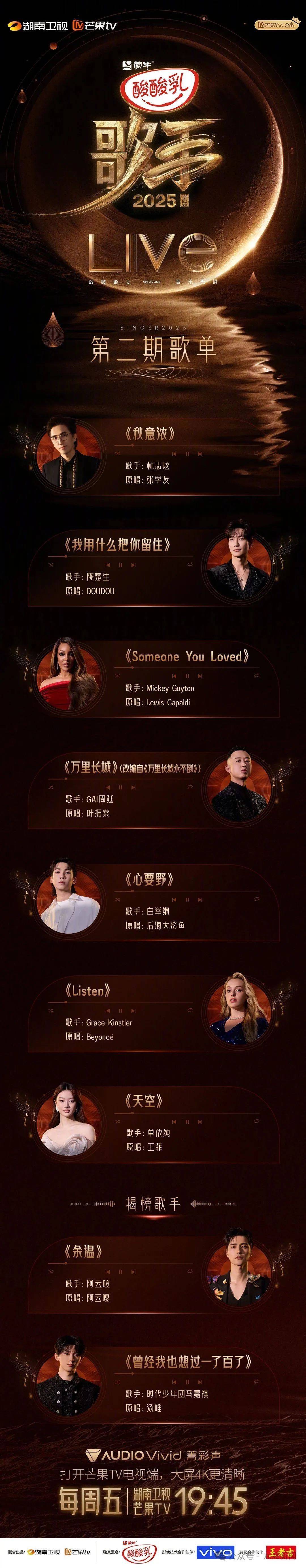 5月23日晚,《歌手2025》第二期播出,单依纯再次拿劣等一,阿云嘎揭榜陈楚生失败,马嘉祺揭榜白举纲到手。详细两场分数进展,林志炫缺憾离开舞台。
