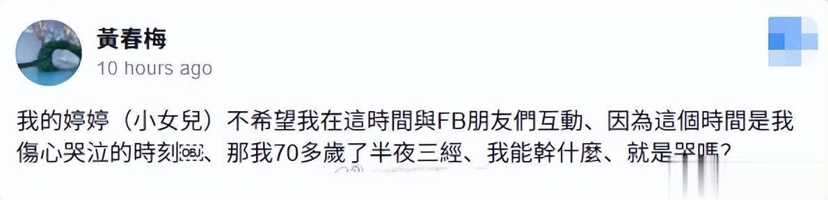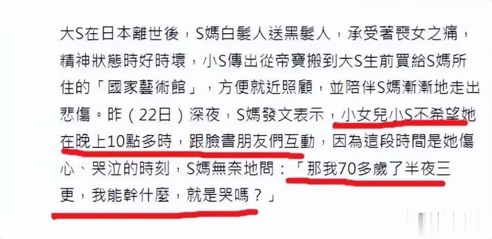 5月22昼夜深,S妈黄春梅发文称小S不但愿她在夜深和网友互动,因为那是她最伤心的时候。很彰着小S此举一是为了让东说念主母亲早点走出来,同期频繁熬夜关于一位70多岁的老东说念主健康也很不利;二是姐姐大S还是离世100多天,不但愿这件事情反复被网友说起,成为东说念主们茶余饭后的谈资。