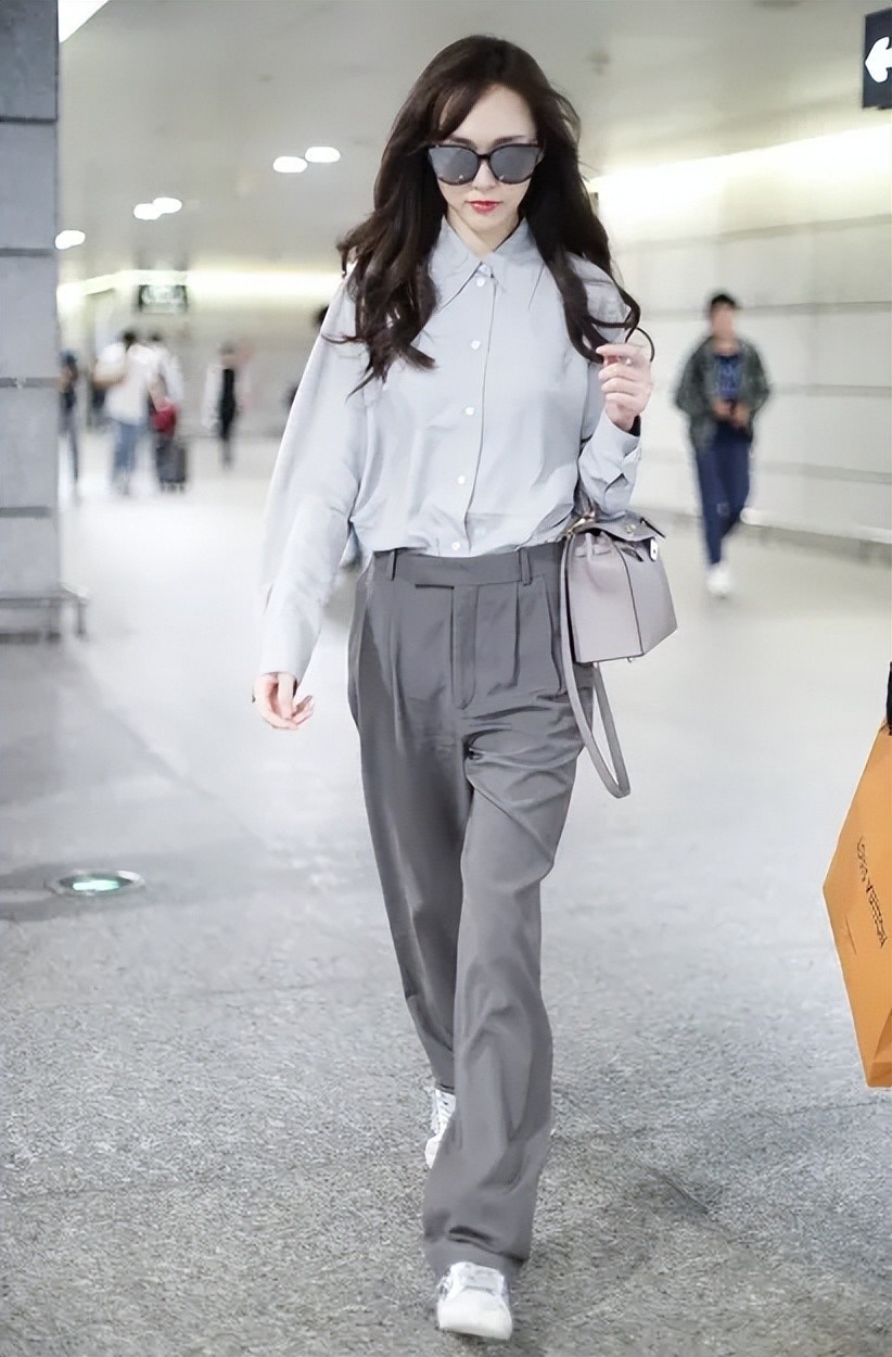 我们接着再来看底下这位女明星,用一件浅蓝色的衬衫上衣来搭配上灰色的西装裤,这身穿衣打扮格外稳妥平素穿搭