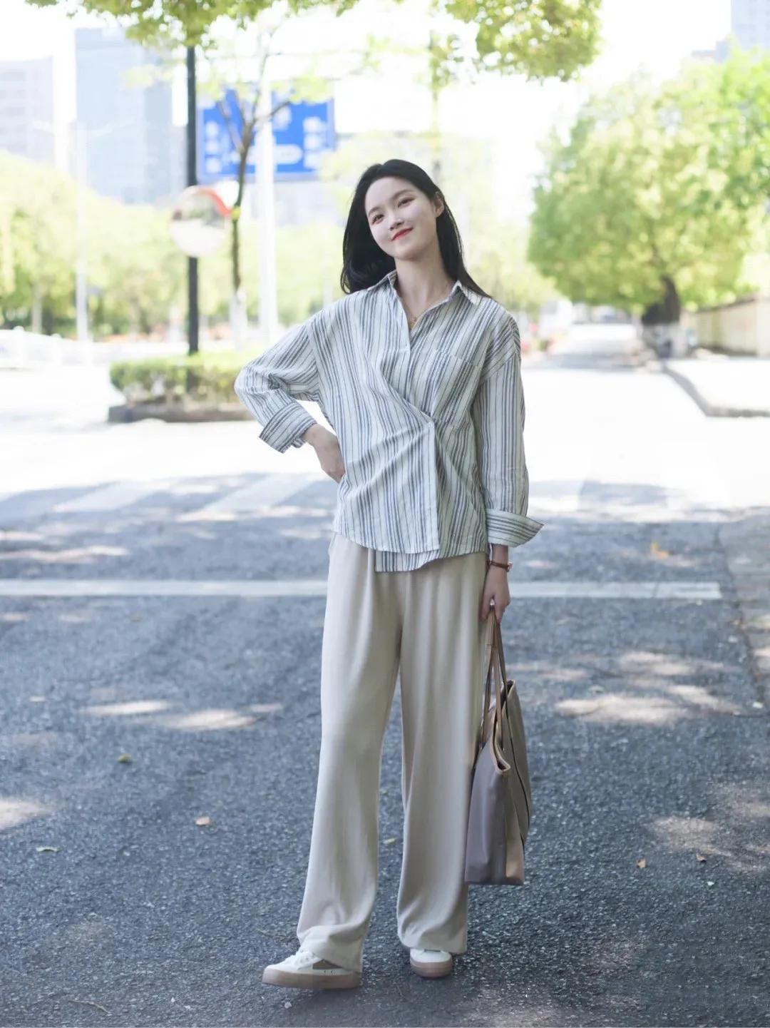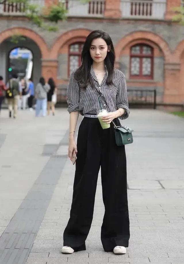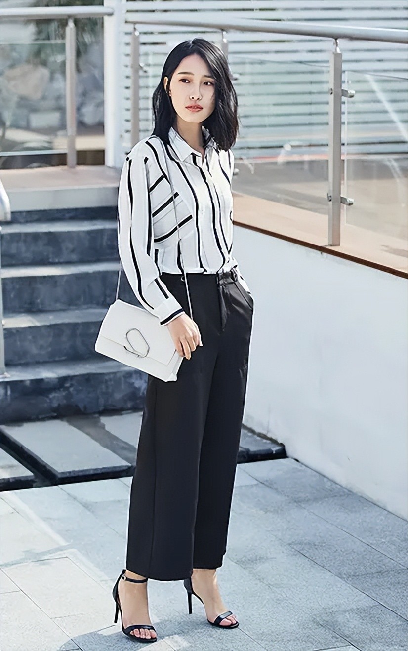 举例底下这一件是曲条纹的衬衫上衣,搭配上玄色的阔腿裤,看起来就会相比细致,整套穿衣配色仅仅是曲两个色调,然而看起来即是很细致,况且这位达东谈主亦然属于小个子女性,穿出来的成果还显高显瘦。