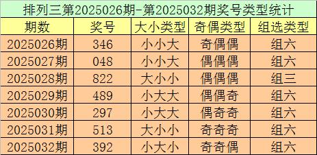 陈设三第2025032期总结:奖号392,奇偶比2:1,大小比1:2,和值14,类型:组六。