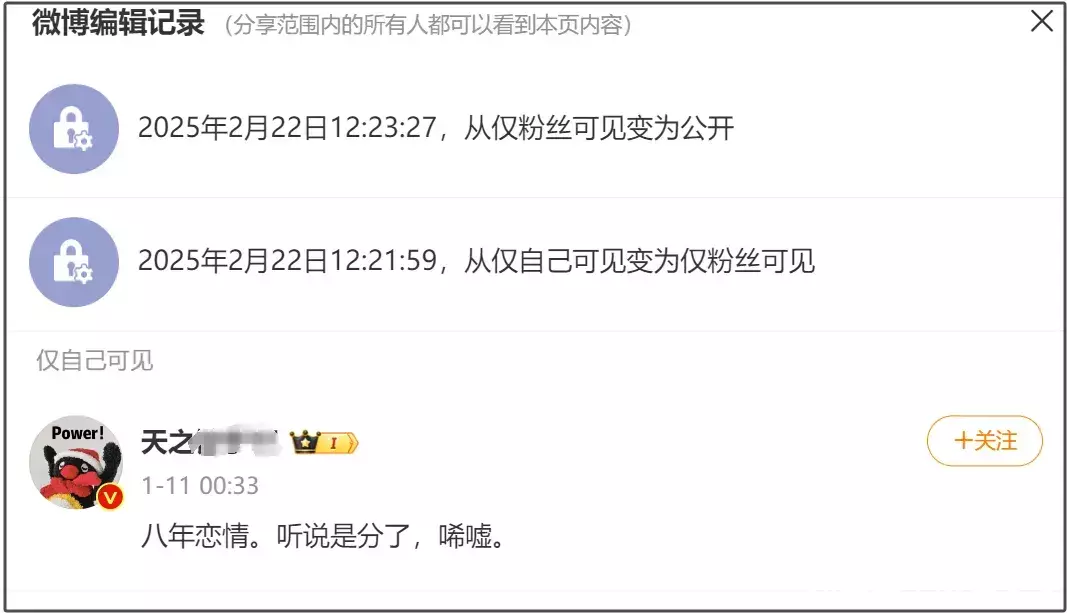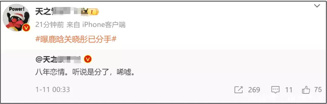 随后,爆料影视剧瓜的博主转发我方1月份发的“8年恋情,外传离异了,唏嘘”的博文回复鹿晗关晓彤离异爆料,他平直带了“曝鹿晗关晓彤已离异”词条。通过剪辑纪录,能看出他1月份的爆料一运转是仅我方可见,尔后是粉丝可见,被传播后透顶公开。